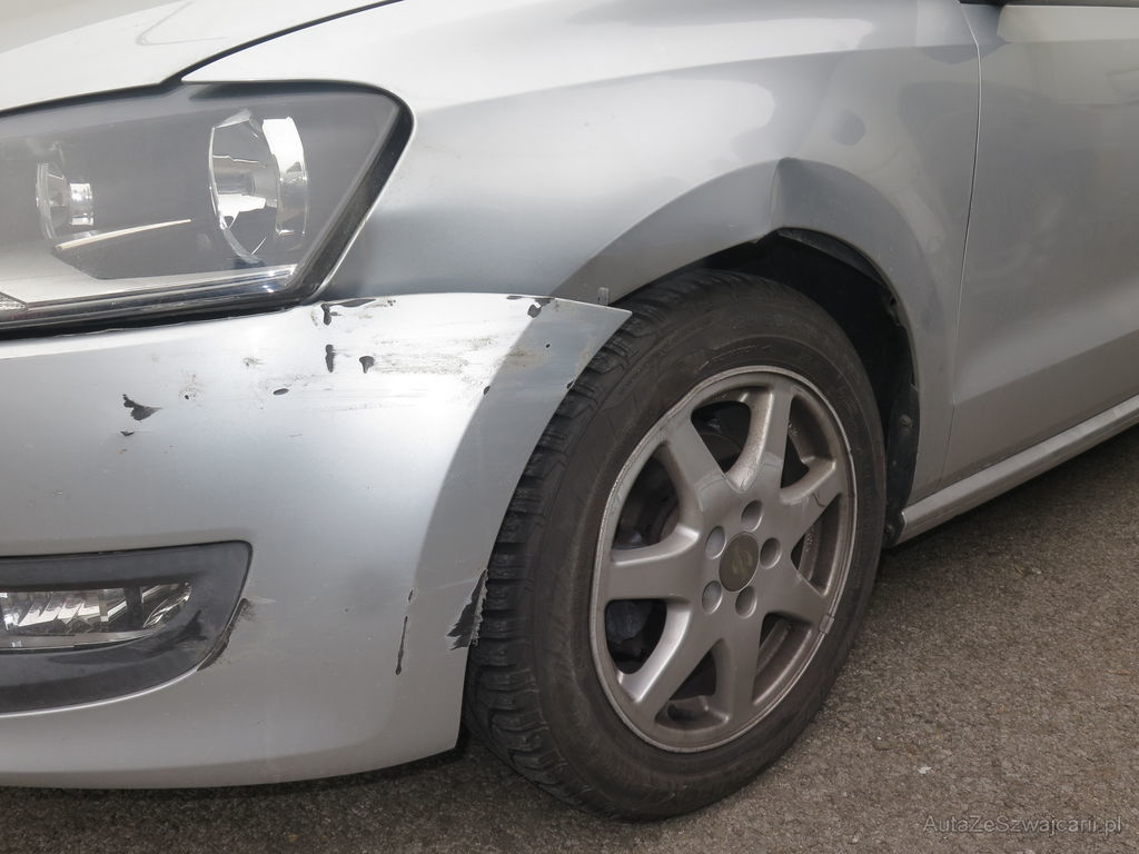 Pare-chocs avant enfoncé, éclairage gauche cassé, aile avant gauche enfoncée, porte avant gauche légèrement endommagée, aile arrière gauche rayée, pare-chocs arrière cassé, jante avant gauche pliée, suspension refoulée.