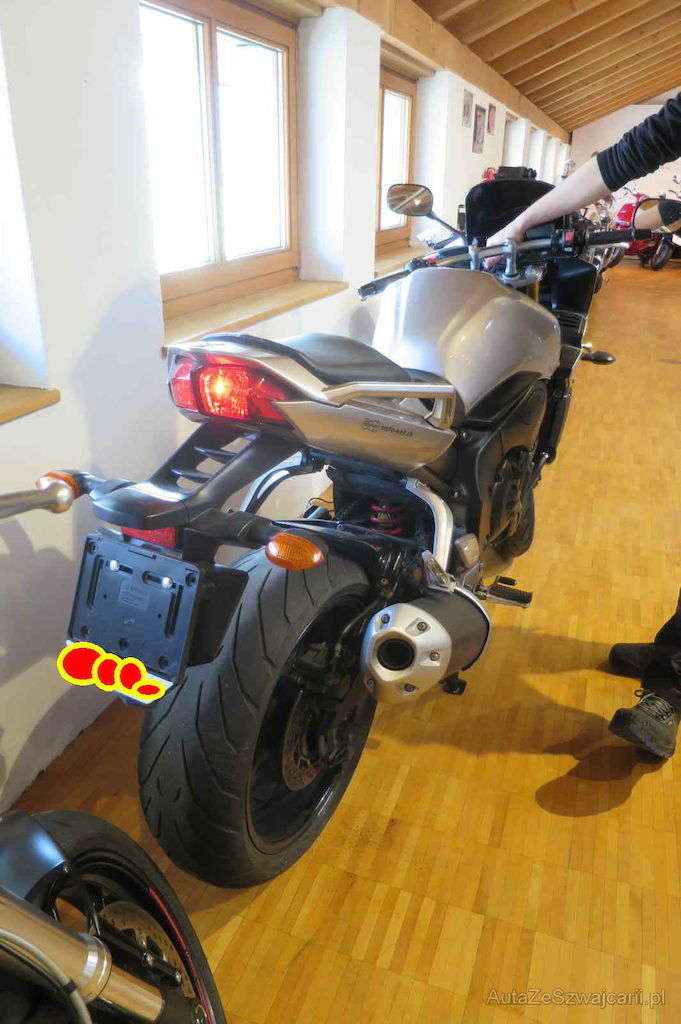 Reifen hinten, Schutzblech hinten, ABS-Sensor hinten rechts mit Abdeckung und Verkabelung, Leichte Lackschäden an Auspuff und Schwinge hinten rechts, Risiko Radnabe und Radaufhängung hinten, Risiko ABS-Geber-Scheibe hinten, Risiko Bremsscheibe und Bremsbeläge hinten, Risiko elektrische Anlage ganzes Motorrad