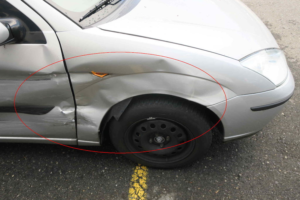 Kotflügel und beide Türen rechts beschädigt. Felge, Achse und Aufhängung vorne rechts beschädigt.