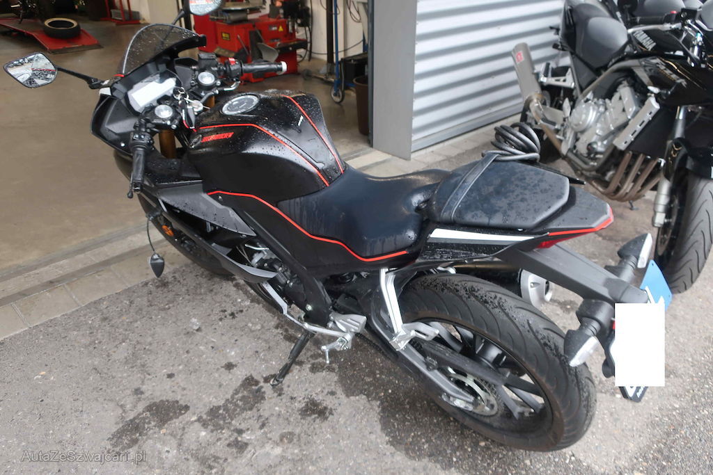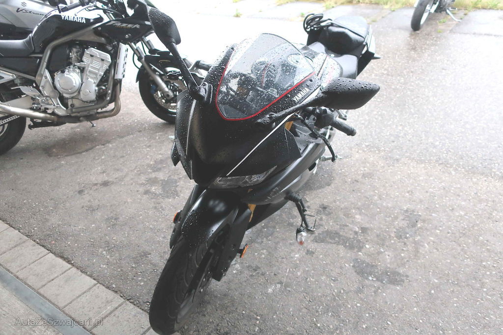 Gabel zerkratzt, Bremsscheibe Vorderrad schlägt, Rückspiegel, Griff und Kupplungshebel l zerkratzt, Bremshebel und Fussrasten l zerkratzt bzw. gebrochen, alle Verschalungsteile l zerkratzt, Schwinge zerkratzt