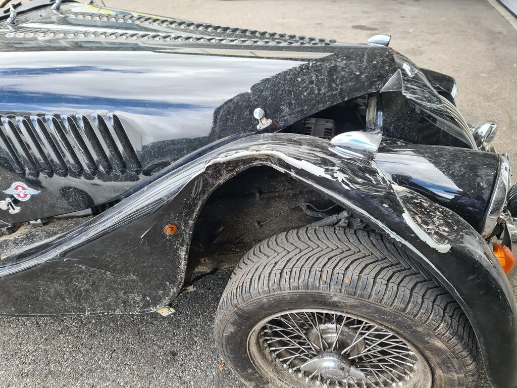 Frontmaske eingedrückt, Scheinwerfer vorne rechts versplittert, Kotflügel vorne links und rechts eingebeult, Motorhaube links und rechts verzogen, Scheibenrahmen abgebrochen, Frontscheibe gesprungen, Armaturenbrett verkratzt, Türe und Seitenwände links und rechts eingebeult, Heckblech eingedrückt, Wagenboden verkratzt, Holzrahmen risiko