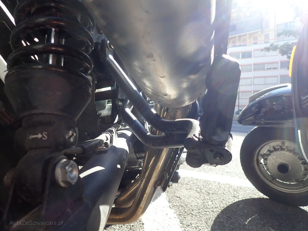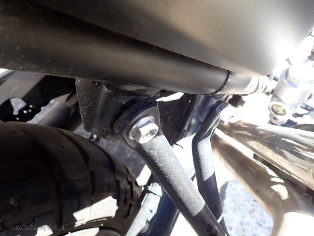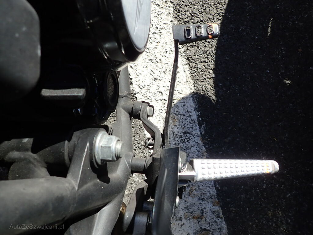 Guidon, réservoir, cadre, échappement, direction, supports, repose-pieds, pédale de frein, levier de frein, rétroviseur, embout de guidon du côté droit.