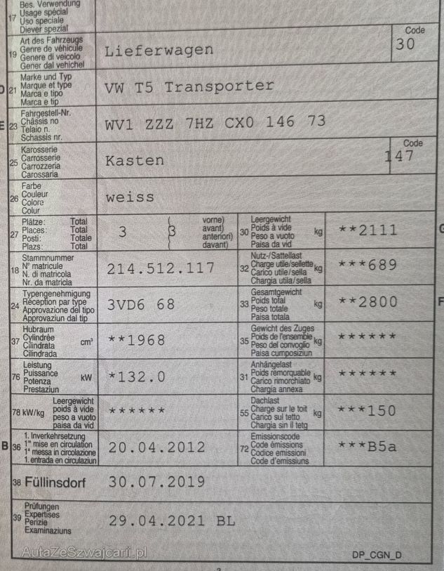 | Information | ACHTUNG!!!! Der Kunde hat den T5 als Camper umgebaut, aber nicht eingetragen!! im FAHRZEUGAUSWEIS steht Lieferwagen, |
