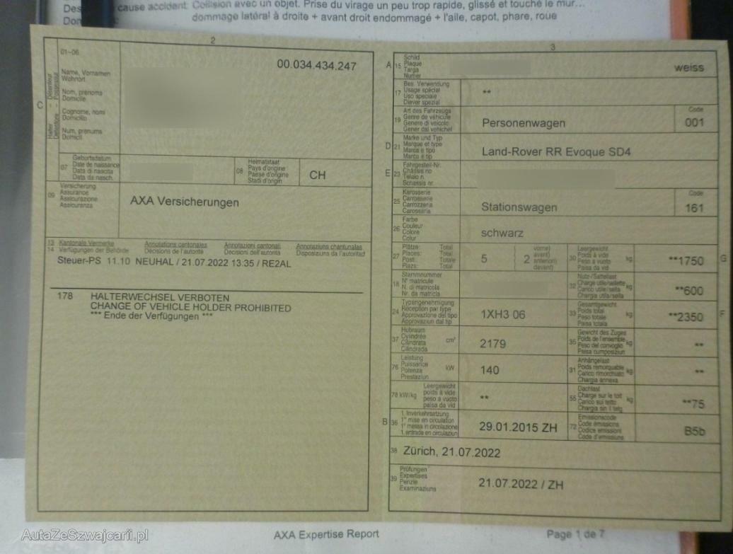 | Damages | Aussenspiegel rechts, Federbein vorne rechts, Front rechts, Kotflügel rechts, Lenkung, Rad hinten rechts, Rad vorne rechts, Radaufhängung vorne rechts, Seite rechts, Seitenwand rechts, Stossstange hinten, Stosstange vorne, Türe hinten rechts, Türe vorne rechts, Vorderachse |