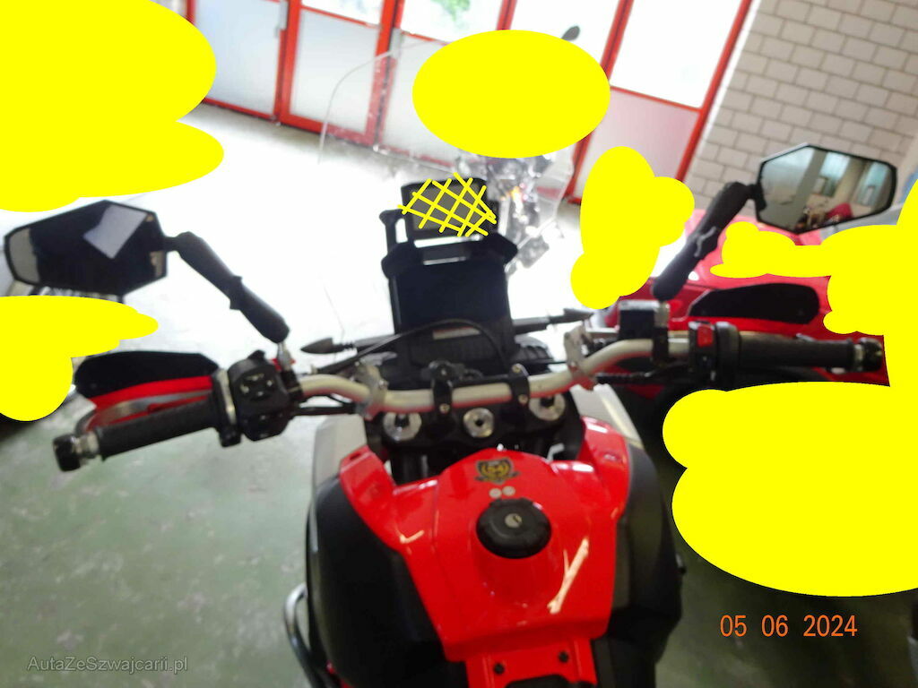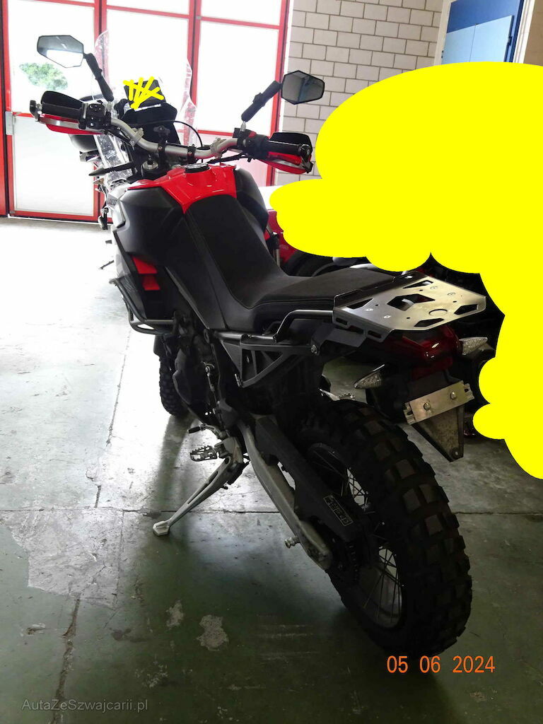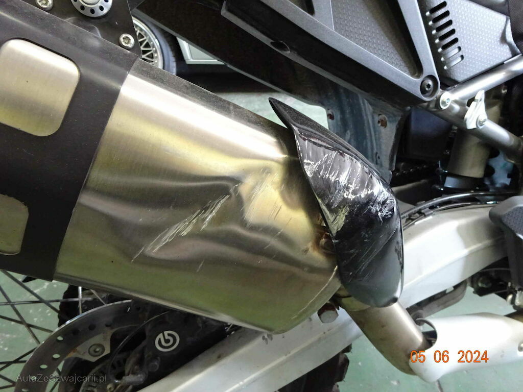Kotflügel vorne, Beide Rückspiegel, Frontscheibe, Lenker, Handschutz rechts, Sturzbügel und Seitenverkleidungen vorne rechts, Motorschutz vorne unten, Fussbremshebel und Fussraster rechts, Auspuff vorne und hinten, Kratzer Schwinge hinten rechts, Sattel links