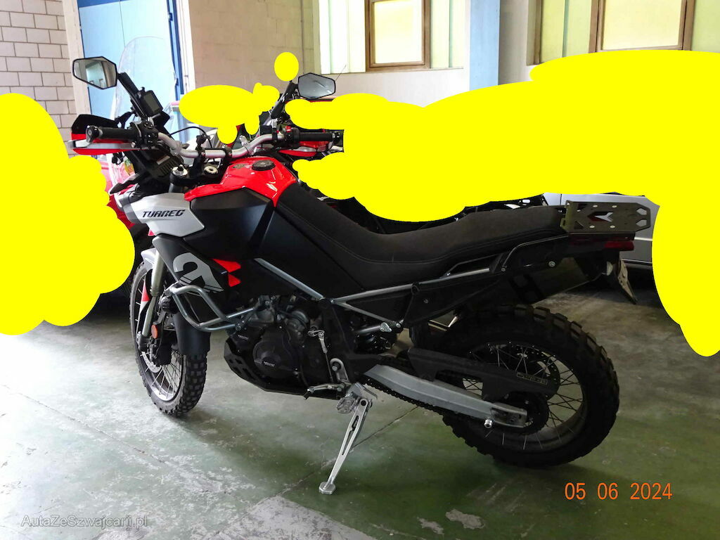 Kotflügel vorne, Beide Rückspiegel, Frontscheibe, Lenker, Handschutz rechts, Sturzbügel und Seitenverkleidungen vorne rechts, Motorschutz vorne unten, Fussbremshebel und Fussraster rechts, Auspuff vorne und hinten, Kratzer Schwinge hinten rechts, Sattel links