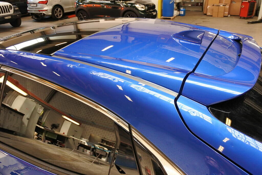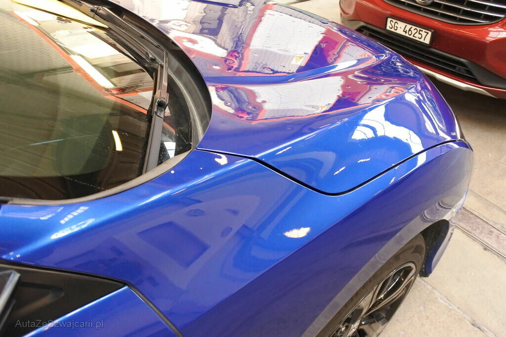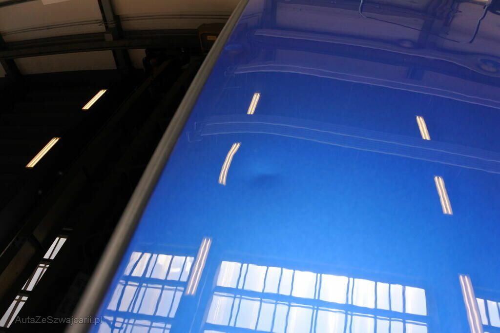 Das Fahrzeug – Exterieur ist an verschiedenen Stellen mit typischen, umfangreichen Hageldellen versehen, wie sie bei einem heftigen Gewitter entstehen können. Diverse Zierelemente, vor allem links sind ebenfalls leicht verformt. Die Frontscheibe ist zerborsten.
