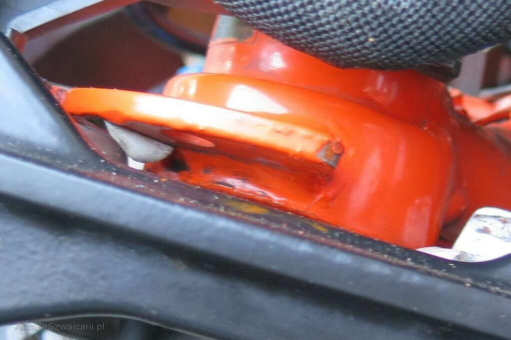 Fourche endommagée, cadre fissuré, rétroviseur gauche râpé, levier gauche et embout de guidon râpés, arceau de protection gauche râpé, repose pieds endommagés.