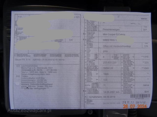 | Ausstattung | Serienaustattung Airbag Fahrer und Beifahrerseite Elektronische Wegfahrsperre Elektrische Fensterheber vorne + hinten Aussenspiegel elektrisch verstellbar Wärmedämmendes Glas Sportfahrwerk Seitenairbag Fahrer und Beifahrerseite Zentralverriegelung mit Fernbedienung Lenkrad verstellbar Stabilitäts- und Traktionskontrolle Kopfstützen vorne und hinten ABS und EBV Elektr. Bremskraftverteilung Park Distance Control Reifendruck-Kontrollsystem RDK Sportsitze vorne Aussenspiegelgehäuse in Wagenfarbe Radio Wave Lederlenkrad Cooper S Keine Gewähr auf die Angaben der Serienausstattungen Sonderausstattung Klimaautomat CD-Player Sitzheizung vorne Bordcomputer Sperrdifferential Nebelscheinwerfer Höhenverstellbarer Beifahrersitz Sport-Lederlenkrad Dynamische Stabilitäts-Control Multifunktionslenkrad/ Tempomat Ausstattung Chili HiFi-System Radio Boost Blinkleuchten weiss Aussenspiegel verchromt Xenon-Scheinwerfer inkl. Waschanlage Pack Raucher Beheizung für Aussenspiegel und Frontscheiben-Waschdüsen Lichtpaket Pack Cockpit Chrono Armauflage vorn Pack Ablage Chrome Line Interieur |