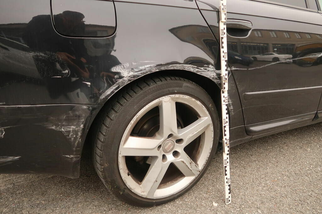 Pare-chocs arrière, feu arrière, aile arrière, jante arrière, portes arrière et avant, aile avant; endommagés.
