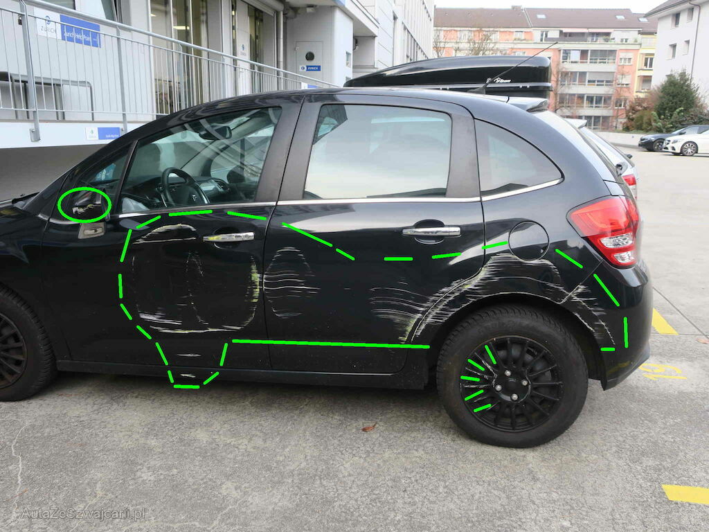 | Information | Kollision mit Säule in Einstellhalle Türe vorne und hinten links, Spiegelgehäuse links, Schweller links, Seitenwand hinten, Radzierblende und Stosstange hinten links beschädigt An Seite rechts sind leichte Gebrauchsspuren und Türschläge ersichtlich |