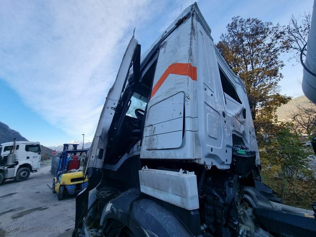 Cabine et malaxeur déformés, pare-brise, pare-chocs phares et vitrages cassés, essieux désalignés, jantes gauche pliées, direction faussées, cadre plié, réserve d'air, réservoir ad blue et carburant déformés, risque sur moteur et transmission car le véhicule s'est renversé, pas d'alimentation électrique cause inconnue. Le béton a été retiré du malaxeur.