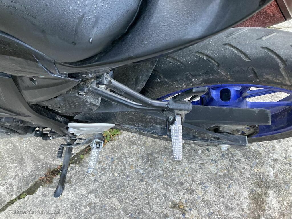 Zone avant: phare, carénage, garde boue, deux poignées, deux retroviseurs, marqués, cassés. Jante, disque et fourche pliés. Flanc gauche: selecteur de vitesses, carénage avant gauche et arrière, repose pied arrière griffés, marqués, pliés.
