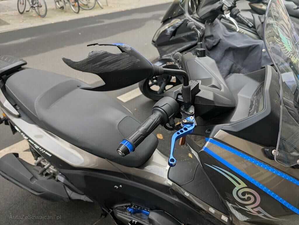 Rétroviseurs, leviers de frein avant, embouts de guidon, garde-boue avant, carénages flanc droit, châssis, repose-pied arrière, cache de plancher, couvercle ventilateur, bras de suspension arrière, support moteur, protection et pot d'échappement, garde-boue arrière, top box, béquille principale, endommagés.
