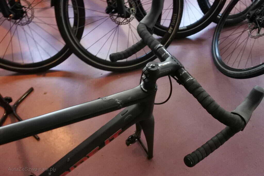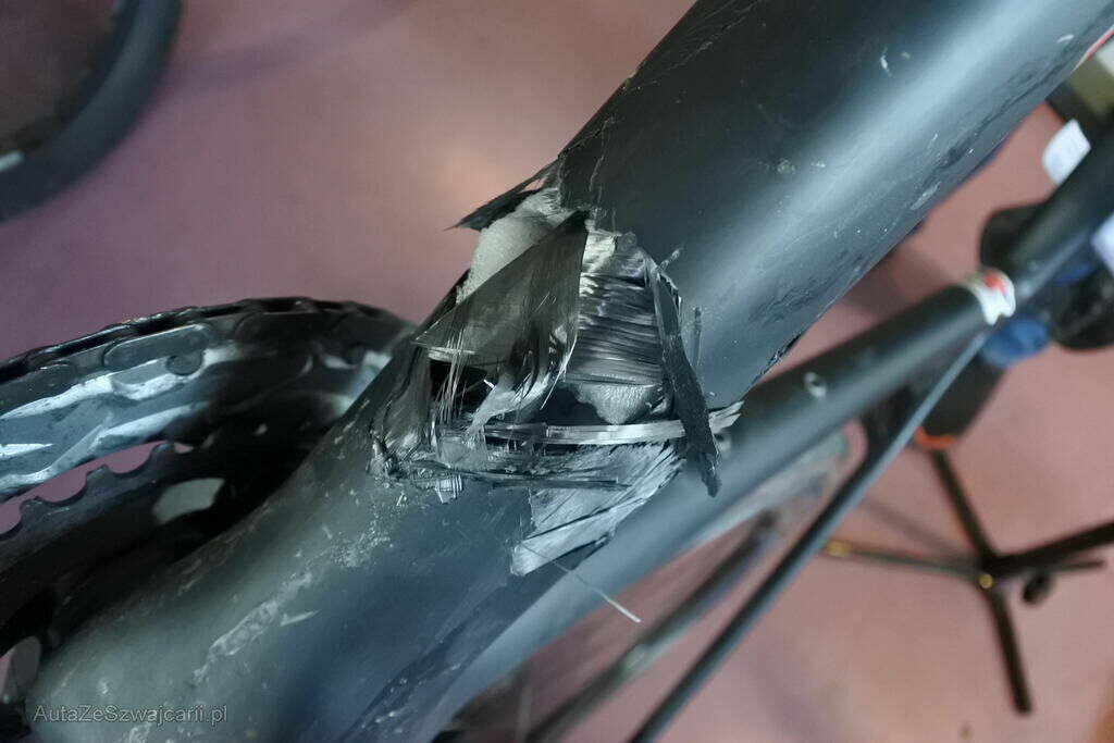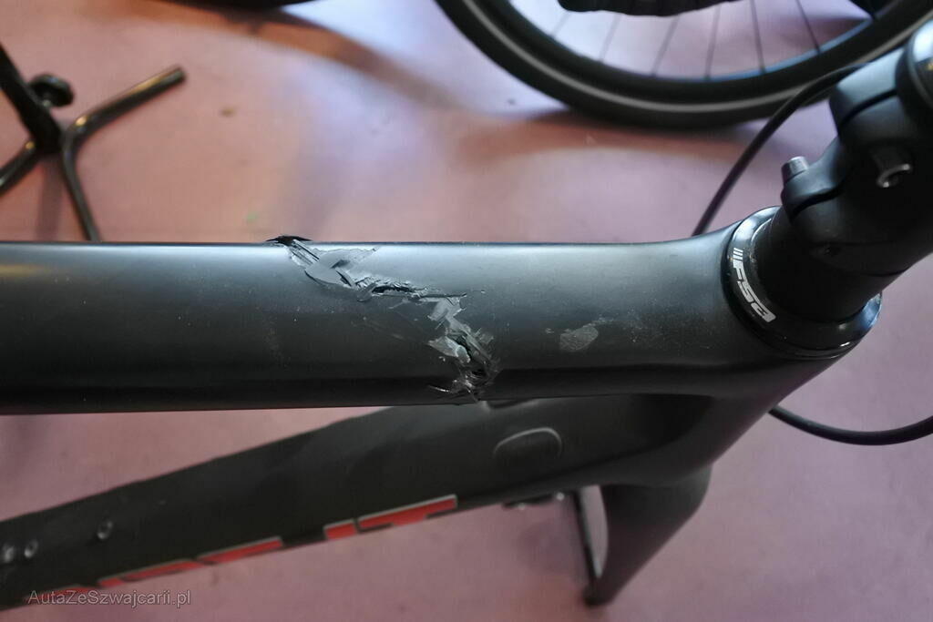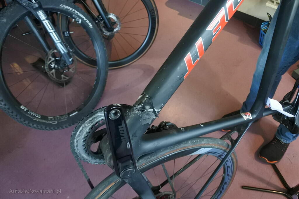 Der Carbon gefertigte Hauptrahmen ist ab Ober- und Unterzug zerrissen. Der Reifen vorne ist drucklos. Die Brems - u. Schalthebel sind beschädigt. Der Lenker inkl. Bandage ist deformiert und der Wechsel weist Kontaktspuren auf.