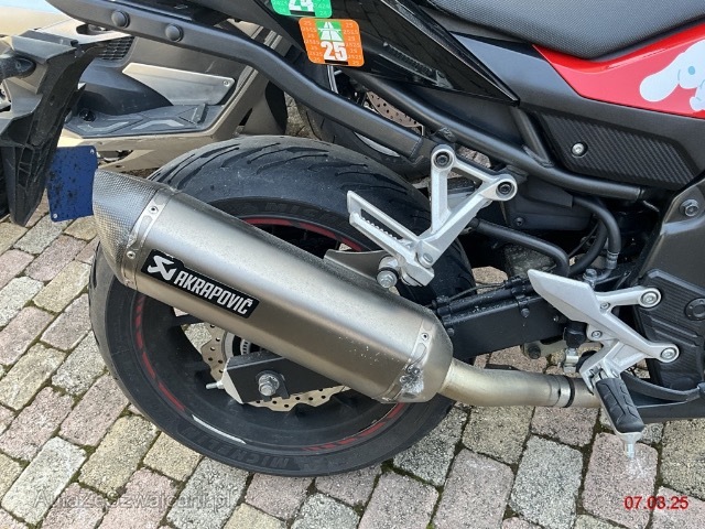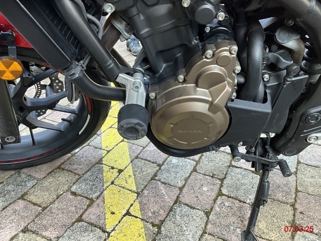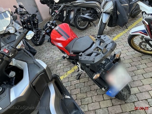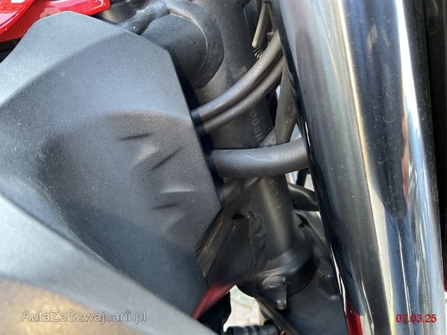| Schadensbeschreibung | Choc avant puis chute côté droit. Fourche complète, réservoir, échappement, carénages, périphériques, roue avant, compteur, guidon... |