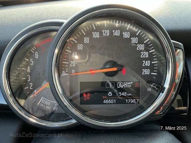 | Serienausstattung | Ablagenpaket, Ablagefach, Cupholder, Media: DAB+ (Digital Audio Broadcasting), Cornering Brake Control (CBC), Dynamische Stabilitätskontrolle (DSC), Dynamische Bremsleuchten, Türgriffe innen verchromt, Intelligenter Notruf, Befestigungsösen im Laderaum, Airbag Beifahrer deaktivierbar, Dekor: Colour Line Carbon Black, Sitze: Vordersitze höhenverstellbar, Wegfahrsperre elektronisch, Bordcomputer, Start-/Stop-Knopf, Crash-Sensor, Zentralverriegelung mit Fernbedienung, Lackierung: Metallic-Lackierung, Antiblockiersystem (ABS), ISOFIX Kindersitzvorrichtung, Elektronischer Bremskraftverteilung EBD, 3-Punkt-Sicherheitsgurte auf allen Plätzen, Klimatisierungsautomatik, MINI Repair Inclusive 4 Jahre oder 200'000 km, Media: USB-Anschluss, Dekor: Interieuroberflächen Piano Black, Aux-In Anschluss, Start/Stop-Funktion, Verbandskasten, Licht: Nebelschlussleuchte, Drehzahlmesser, Elektrische Fensterheber vorne, Getriebe: 6-Gang-Getriebe, Reifendruck-Kontrollanzeige, Servotronic, Polster: Stoff-Ausstattung, Leuchtweitenregulierung elektrisch, Innenraumbeleuchtung, Ambientebeleuchtung, Gurtstraffer vorne, Traffic Information, 12-Volt-Steckdose vorne, Licht: Tagfahrlicht, Leichtmetallräder Cosmos Spoke 17J, schwarz, Laderaumbeleuchtung, Sonnenschutzverglasung, Lenkrad: Sport-Lederlenkrad, Katalysator geregelt, Nichtraucherausführung, Türgriffe aussen verchromt, Drittes Bremslicht, Heckscheiben-Wisch-/Waschanlage mit, Licht: Halogenscheinwerfer, Lenkrad: Lenkrad längs- und höhenverstellbar, Nebelscheinwerfer, Dachspoiler, Lenkrad: Multifunktion für Lenkrad, Veloursfussmatten vorne und hinten, Licht: Abblendlichtausschaltverzögerung 'Follow me home', Dachhimmel Anthrazit, Sitze: Rücksitzlehne geteilt abklappbar, Kopfstützen hinten, Lichtpaket, Scheibenwischer vorne mit Regensensor und automatischem Einschalten der Abblendlichter, MINI Mobility System, Licht: Weisse Blinkleuchten Zusatzblinkleuchten, in Seitenwand vorne in Weiss, Airbag: Airbag Fahrer und Beifahrer, Abschliessbare Radschrauben, Aussenspiegel in Wagenfarbe |