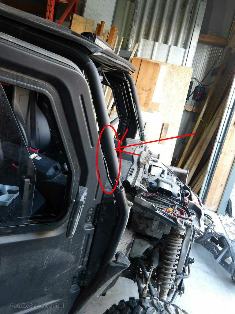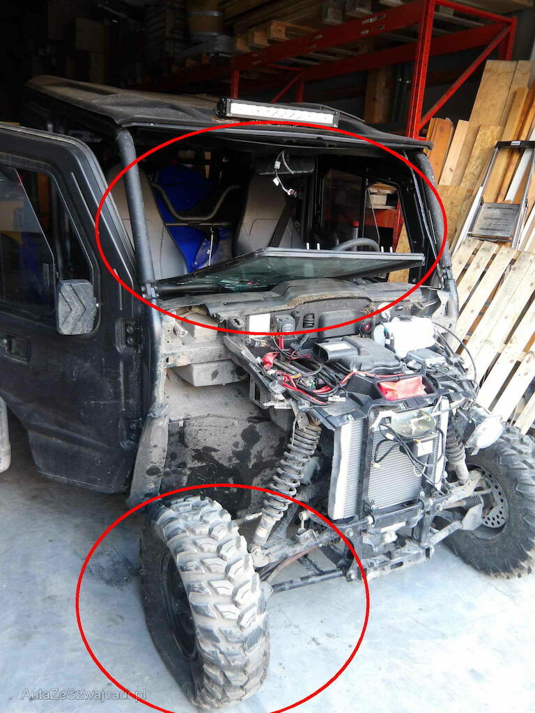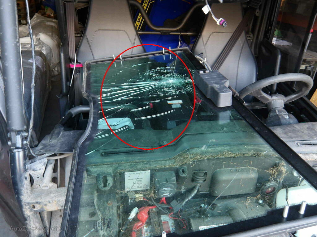 Parechoc, calandre, radiateur, train avant droite, chassis plié, arceau déformé, parebrise.