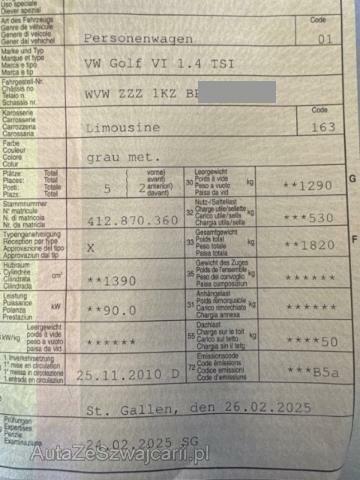 | Ausstattung | Serienaustattung Wärmeschutzverglasung grün Höhenverstellbare Vordersitze Airbag Fahrer und Beifahrerseite Kopfairbag vorne und hinten Seitenairbag Fahrer und Beifahrerseite Elektronische Wegfahrsperre Lenksäule mit Höhen- und Längseinstellung Zentralverriegelung mit Funkfernbedienung Geschwindigkeitsregelanlage GRA Aussenspiegel elektrisch verstellbar und heizbar Klimaanlage Climatronic 2-Zonen Elektrische Fensterheber vorne Sportsitze vorne Lendenwirbelstützen Vordersitze Deaktivierung Beifahrerairbag Mittelarmlehne hinten mit Durchladesystem Elektrische Fensterheber hinten Mittelarmlehne vorne mit Ablagebox Fussmatten vorne + hinten Rücksitzbank ungeteilt/ Lehne 1/3 zu 2/3 geteilt umklappbar ESP inkl. Bremsassistent/ ABS/ ASR/ EDS Staub- und Pollenfilter ohne Aktivkohlefilter Tagfahrlichtschaltung Multifunktionsanzeige Plus MFA Isofix Kindersitzverankerung für Rückbank Aussenspiegel und Türgriffe in Wagenfarbe Servolenkung elektromechanisch u. geschwindigkeitsabhängig Multifunktions-Lederlenkrad 3-Sp/ MF-Anzeige Plus Nebelscheinwerfer vorne/ Abbiegelicht Knieairbag Fahrer Leichtmetallräder 16" Cleveland Dekoreinlagen in Chrom matt Sitzbezüge in Alcantara/ Stoff/ Dropmag Radio/ CD RCD 310 Plus/ MP3/ 8 Lautsprecher Tire mobility system Keine Gewähr auf die Angaben der Serienausstattungen Sonderausstattung Lackierung Metallic oder Perleffekt |