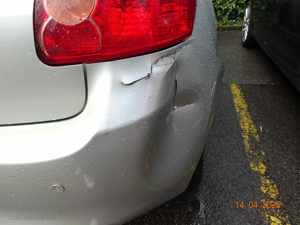 Stossstange hinten gerissen, Rückleuchte rechts gebrochen, Heckblech gestaucht, Seitenwand rechts deformiert.