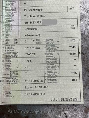 | Ausstattung | Serienaustattung Klimaautomat Airbag Fahrer und Beifahrerseite Elektronische Wegfahrsperre Sitzheizung vorne Elektrische Fensterheber vorne + hinten Aussenspiegel elektrisch verstellbar und heizbar Tempomat Seitenairbag Fahrer und Beifahrerseite Nebelscheinwerfer Zentralverriegelung mit Fernbedienung Lederlenkrad Mittelarmlehne hinten Innenspiegel automatisch abblendbar Lenkrad verstellbar Sitzbezüge in Stoff/ Alcantara Kopfairbag vorne und hinten Regensensor Aussenspiegel elektrisch anklappbar Lendenwirbelstütze Fahrersitz Audiofernbedienung am Lenkrad Stabilitätskontrolle VSC + Traktionskontrolle TRC Leichtmetallräder 17" Rückfahrkamera Knieairbag Fahrer Isofix-Kindersitzbefestigung hinten Dämmerungs-Sensor Rücksitzlehnen getrennt abklappbar 60:40 Panorama-Glasdach Reifendruck-Überwachungsanzeige Abgedunkelte Scheiben hinten Fernlichtassistent Smart entry-start/ Schliess- Startsystem Anschluss USB und AUX Reifen-Reparatur Set LED-Scheinwerfer LED Tagfahrlicht ABS und EBD Elektr. Bremskraftverteilung inkl. BA Multi-Informationsdisplay Start + Stopp Automatik Spurwechselassistent Fahrer- und Beifahrersitz verstellbar Keine Gewähr auf die Angaben der Serienausstattungen Toyota Touch 2/ CD/ MP3/ Bluetooth/ DAB+ Verkehrsschild-Erkennungssystem Pre Collision System Gratis-Service 6 Jahre/ 60'000 km Sonderausstattung Metallic- oder Mica Lackierung Pack Basic Navigationsmodul Touch 2 Go |