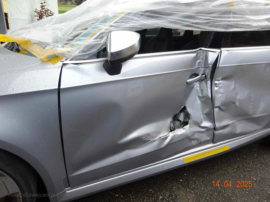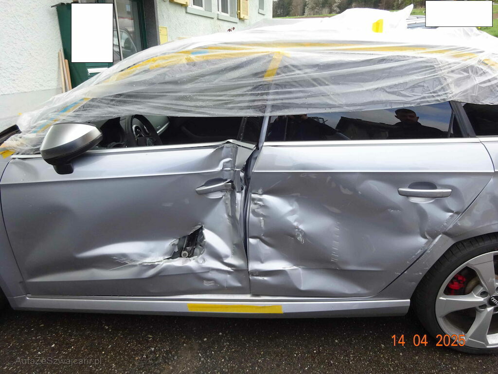 Türe vorne links stark deformiert und gerissen, Türe hinten links, stark deformiert, Seitenwand links deformiert, B-Säule geknickt, Türscheibe links gebsprängt, Felge hinten links Kratzer, Schweller links beule. Kotflügel vorne links Beule