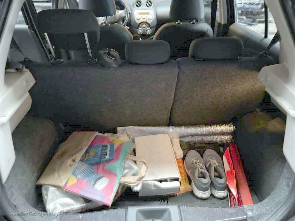 | Serienausstattung | Handschuhfach, Leseleuchten vorne, Sitze: Fahrersitz höhenverstellbar, Make up-Spiegel rechts, Kindersicherung an den hinteren Türen, Gurtstraffer vorne, Getönte Scheiben, Lenkrad: Lenkradfernbedienung, Gurtkontrolle, Tageskilometerzähler, Stufenloser Automat, Friendly Lighting, Pollenfilter (Staubfilter), Airbag: Airbag Beifahrer deaktivierbar, Nissan Connect: Navigationssystem mit Farbdisplay USB-Schnittstelle, iPod-Gate Radio/CD mit 6 Lautsprechern, Elektronisches Stabilitäts-Programm (ESP), Wegfahrsperre elektronisch, Make up-Spiegel links, Kofferraumbeleuchtung, Automatische Türverriegelung geschwindigkeitsabhängig, Innenspiegel abblendbar, Seitenschutzleisten in Wagenfarbe, Haltegriffe für Beifahrer und Fondpassagiere, ISOFIX Kindersitzvorrichtung, Drehzahlmesser, Armlehne für Fahrersitz, 3-Punkt-Sicherheitsgurte auf allen Plätzen, Drittes Bremslicht, Digitales Display, Armlehnen an den Türen, Elektrische Fensterheber vorne, Tankdeckel-Entriegelung von innen, 4 Leichtmetallfelgen 15J mit Pneu, Klimatisierungsautomatik, Airbag: Airbag Fahrer und Beifahrer, Kartentasche an der Rückenlehne, Vorhangairbags vorne und hinten, Seitenairbags, ABS, EBD elektronische Bremskraftverteilung, Aussenspiegel rechts und links elektrisch verstellbar, Aussenspiegel in Wagenfarbe, Zentralverriegelung mit Fernbedienung, Bordcomputer, Anzeige von: Aussentemperatur, Verbrauch, Uhrzeit, Kraftstoffreserve, Geschwindigkeit, Wartungseinstellungen, Frontscheibe Verbundglas, Servolenkung geschwindigkeitsabhängig, Stossstangen in Wagenfarbe, Notrad, Heckscheibenheizung, Nebelscheinwerfer, Heckscheibenwischer, zweistufig, Katalysator geregelt, 3 Kopfstützen hinten, Nebelschlussleuchte, Rücksitze geteilt abklappbar, Defrosterdüsen für Front- und Seitenscheiben, Bluetooth-Schnittstelle mit Freisprecheinrichtung, Türgriffe aussen in Wagenfarbe, Lenkrad höhenverstellbar, Bremsassistent (BAS), Sitzbezüge Stoff (Ivory) mit Sitzheizung vorn, Cupholder vorne und hinten, Lackierung: Uni-Lackierung |