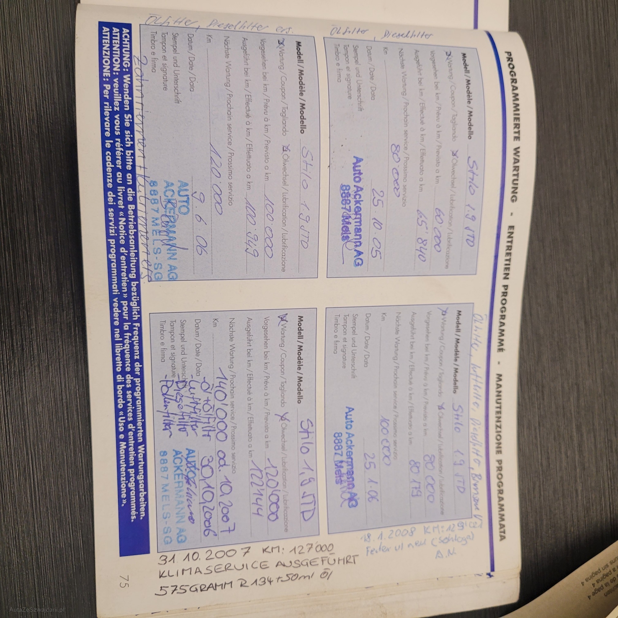 Kommentar | Fiat Emblem vorne def., Türe links vorne und hinten Beule und zerkratzt, Stossfänger hinten links zerkratzt, letzte MFK 04.04.2025. Es wurden keine weiteren Werkstatttest durchgeführt. Jede Gewährleistung, soweit nach Gesetz möglich, wird wegbedungen. Insbesondere sind Wandelung und Minderung ausgeschlossen. |