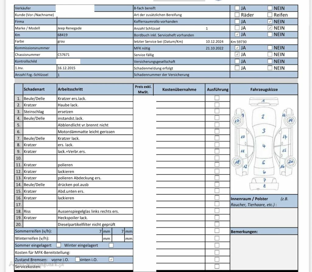 Information | Keine technische Prüfung (Werkstatttest) vorgenommen Diverse Schäden an Karosserie/Lack. Fahrzeug ab Platz, ohne Garantie und Aufbereitung. DPF/FAP Filter nicht kontrolliert Keine Gewähr auf die Angaben der Sonder- und Serienausstattung / keine mechanische Prüfung. Fahrzeug wurde unzerlegt expertisiert / keine Haftung für allfällige, nach Demontage bekanntwerdenden Mängel. Fahrzeugbereifung und Ausstattung gemäss Fotos / Fahrzeugkauf auf eigenes Risiko ab Platz ohne Nachwährschaft. - Div. Kratzer und Dellen am gesamten Fahrzeug. - Div. Flecken und Kratzer im Innenraum. - Div. Kratzer an den Felgen. -Service regelmässig gemäss Bilder |