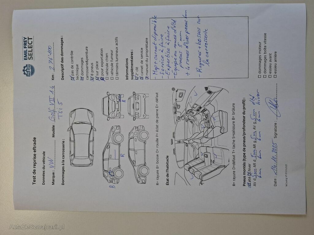Information | 2 clés Map + carnet de service disponible Service à faire Expertise à faire Equipé en roues d'été pneus 5 mm + 4 roues d'hiver pneus 6 mm Freins avant 50 % Freins arrière 50 % Ryures et bosses sur la carrosserie Pas de contrôle technique (essai en atelier) effectué |