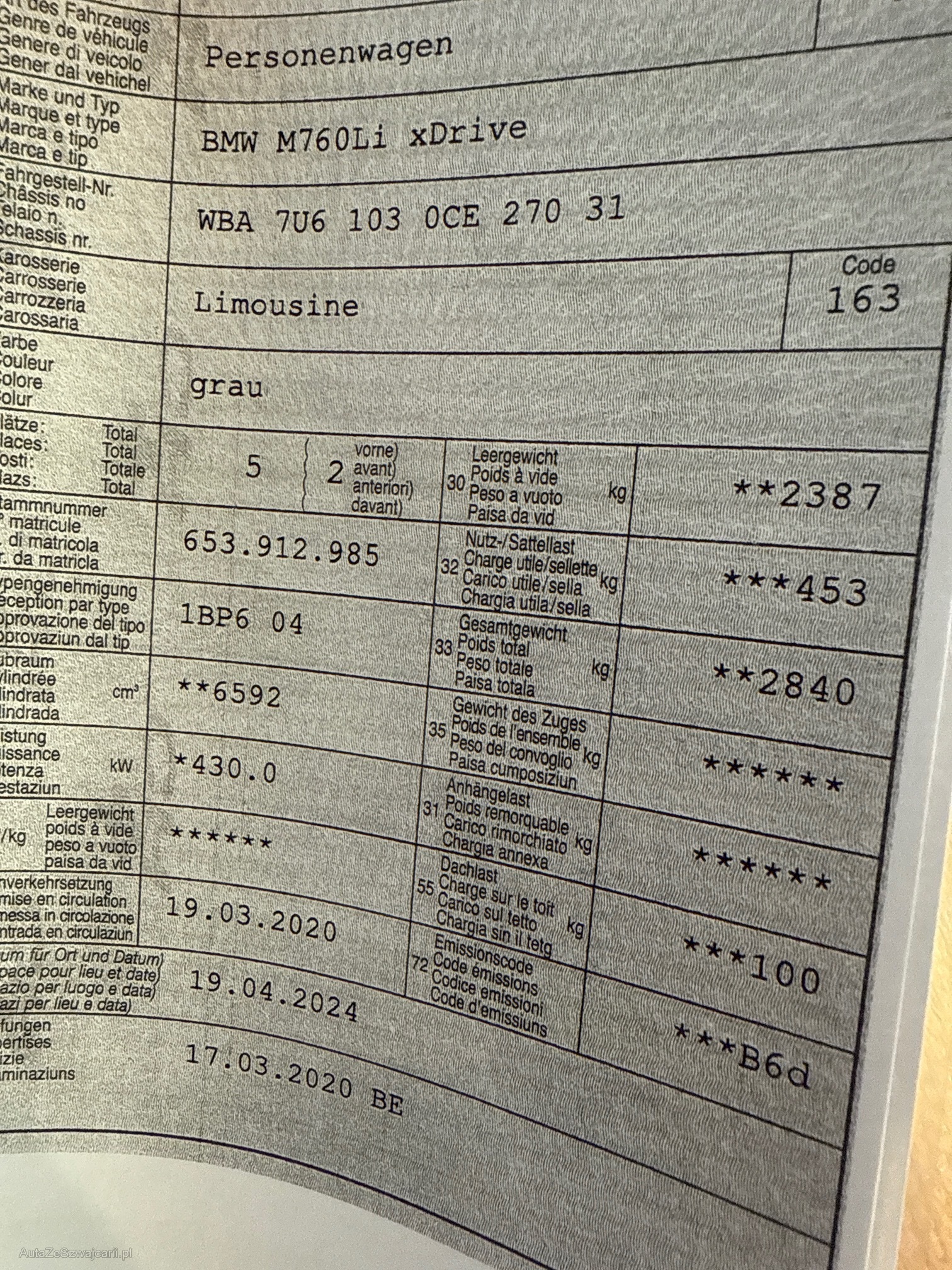 Kommentar | in ca. 10000 Km Bremsen vorne zu ersetzten, eine Felge angefahren, kleiner Parkschaden HR ( kann mann drücken ) *Die angezeigten Daten sind möglicherweise unvollständig. Cat Code Bezeichung Preise inkl. MwSt. 7.7% M 7U61 M760Li xDrive 212800.00 P 0490 SONDERLACKIERUNG 0.00 F NASW EXCL.LEDER NAPPA ERW./SCHWARZ 0.00 S 01CB CO2 UMFANG 0.00 S 01DE ABGASTECHNIK EU6 RDE 0.00 S 022N 20"M LM RAED.DO.SPEI. 760M MB 0.00 S 0230 EU SPEZIFISCHE ZUSATZUMFAENGE 0.00 S 02PA RADSCHRAUBENSICHERUNG 0.00 S 02TB SPORT-AUTOMATIK GETRIEBE 0.00 S 02VB REIFENDRUCKANZEIGE 0.00 S 02VH INTEGRAL-AKTIVLENKUNG 0.00 S 02VS EXECUTIVE DRIVE PRO 0.00 S 0302 ALARMANLAGE 0.00 S 0319 INTEGRIERTE UNIVERSAL-FERNBEDIENUNG 330.00 S 0322 KOMFORTZUGANG 0.00 S 0323 SOFT-CLOSE-AUTOMATIK FUER TUEREN 0.00 S 0356 KLIMAKOMFORT-VERBUNDVERGLASUNG 0.00 S 0358 KLIMAKOMFORT-FRONTSCHEIBE 0.00 S 03DS BMW DISPLAY SCHLUESSEL 0.00 S 0407 PANORAMA-GLASDACH SKY LOUNGE 2730.00 S 0416 SONNENSCHUTZROLLOS 0.00 S 0428 WARNDREIECK 0.00 S 0453 AKTIVE SITZBELUEFTUNG VORN 1080.00 S 0454 AKTIVE SITZBELUEFTUNG IM FOND 1080.00 S 0456 KOMFORTSITZE ELEKTRISCH VERSTELLBAR 0.00 S 0460 KOMFORTSITZE IM FOND, ELEKTRISCH 0.00 S 0465 DURCHLADESYSTEM 0.00 S 04AS EDELHOLZAUSF. PAPPEL MASER GRAU 0.00 S 04HC WAERMEKOMFORT PAKET 1080.00 S 04NB KLIMAAUTOMATIK MIT 4-ZONENREGELUNG 0.00 S 04ND INSTRUMENTENTAFEL LEDERBEZOGEN 0.00 S 04NM AMBIENT AIR PAKET 440.00 S 04T6 MASSAGEFUNKTION IM FOND 1520.00 S 04T7 MASSAGEFUNKTION FUER FAHRER UND BEI 1520.00 S 04U1 KERAMIKAPPLIKATION F.BEDIENELEMENTE 760.00 S 04UR AMBIENTES LICHT 0.00 S 04UY SKI UND SNOWBOARDTASCHE 380.00 S 0548 KILOMETERTACHO 0.00 S 05AC FERNLICHTASSISTENT 0.00 S 05AU DRIVING ASSISTANT PROFESSIONAL 2360.00 S 05AZ BMW LASERLICHT 2220.00 S 05DN PARKING ASSISTANT PLUS 710.00 S 05DV FERNGESTEUERTES PARKEN 640.00 S 0610 HEAD-UP DISPLAY 0.00 S 0650 CD-LAUFWERK 250.00 S 0654 DAB TUNER 0.00 S 06AC INTELLIGENTER NOTRUF 0.00 S 06AE TELESERVICES 0.00 S 06AK CONNECTEDDRIVE SERVICES 0.00 S 06C4 CONNECTED PACKAGE PROFESSIONAL 0.00 S 06F1 BOWERS & WILKINS DIAMOND SURROUND S 5650.00 S 06NB FONDTELEFON 1140.00 S 06NW TELEFONIE MIT WIRELESS CHARGING 0.00 S 06U3 BMW LIVE COCKPIT PROFESSIONAL 0.00 S 06U8 BMW GESTIKSTEUERUNG 0.00 S 06U9 BMW TOUCH COMMAND 640.00 S 06UK NIGHT VISION MIT PERSONENERKENNUNG 2790.00 S 06WD WLAN HOTSPOT 0.00 S 0710 M LEDERLENKRAD 0.00 S 0715 M AERODYNAMIKPAKET 0.00 S 07CH REPAIR INCLUSIVE 4/200 0.00 S 0851 SPRACHVERSION DEUTSCH 0.00 S 0879 DEUTSCH / BORDLITERATUR 0.00 S 08KA OELWARTUNGSINT. 30.000KM/24MONATE 0.00 S 08R9 KAELTEMITTEL 0.00 S 08TF AKTIVER FUSSGAENGERSCHUTZ. 0.00 S 08TL TAGFAHRLICHT FRONT UND HECK AKTIV 0.00 S 08TR DEKODIERUNG ZUSATZFUNKTIONEN 0.00 S 0962 KENNZEICHENTRAEGER VORNE ENTFALL 0.00 Total Sonderausstattung 27320.00 Total Neupreis 240120.00 |