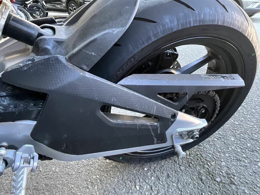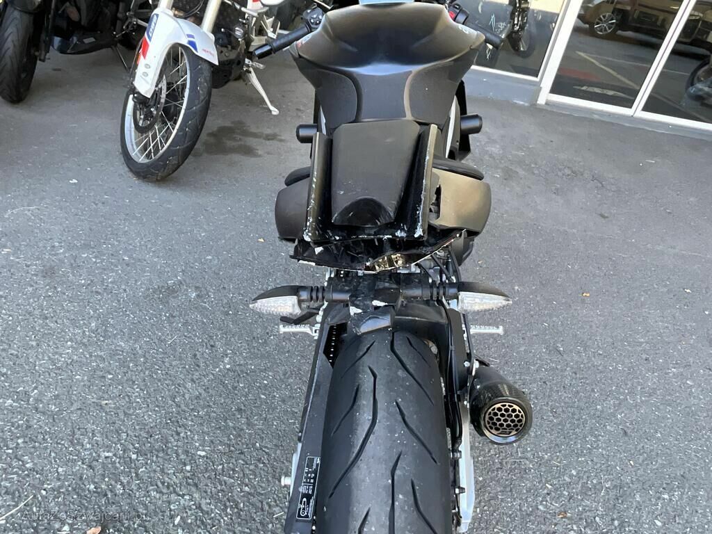 Carénages, guidon, fourche, jante avant, rétroviseur, bras oscillant et cadre arrière, endommagés.