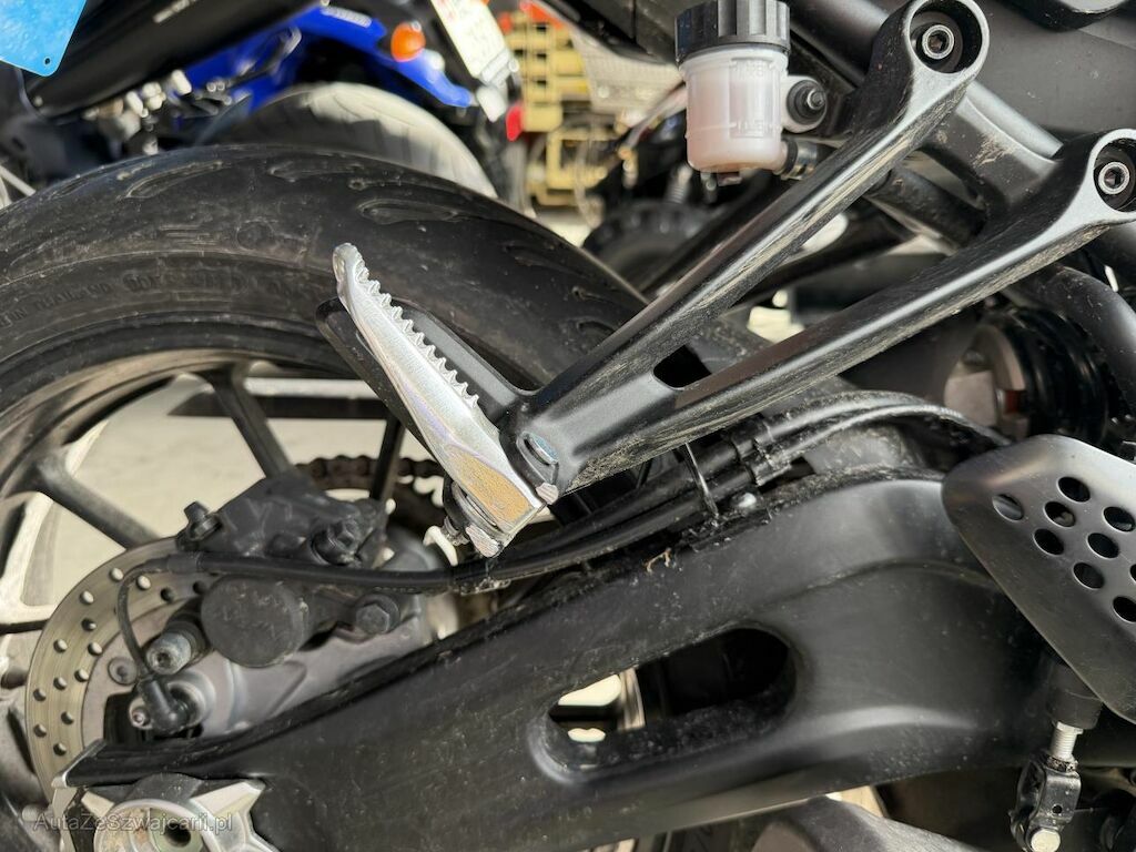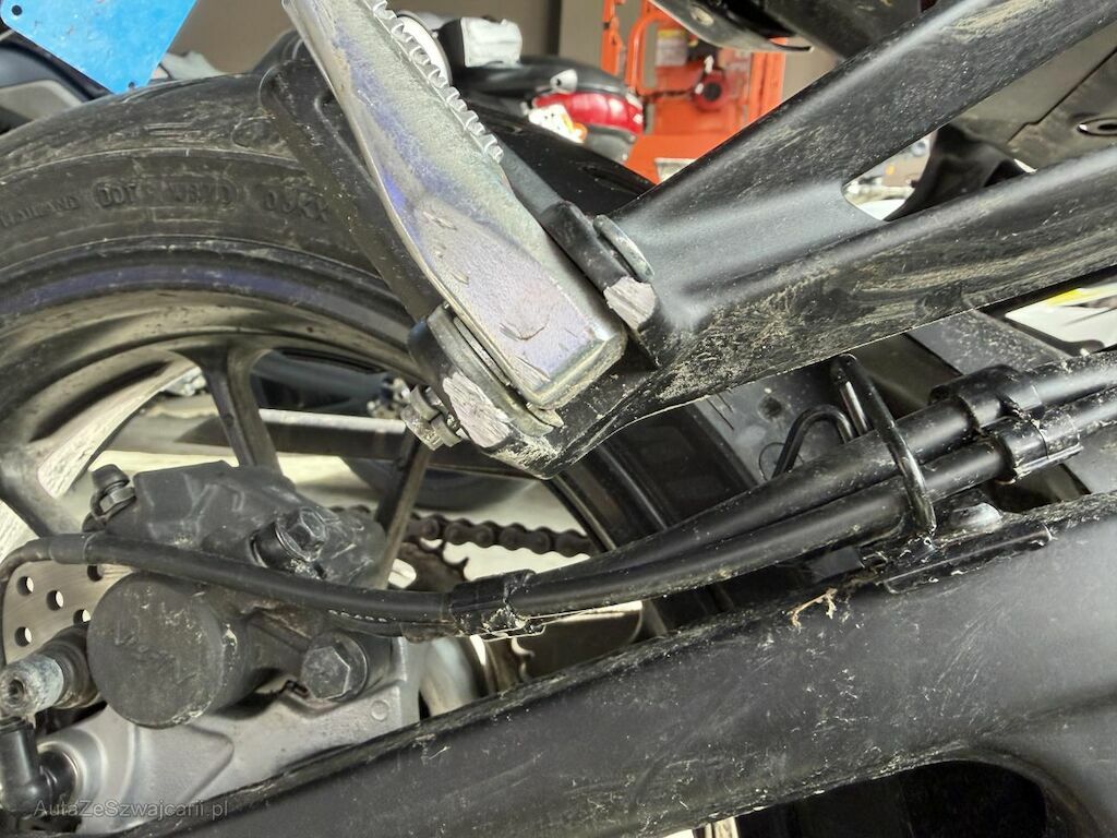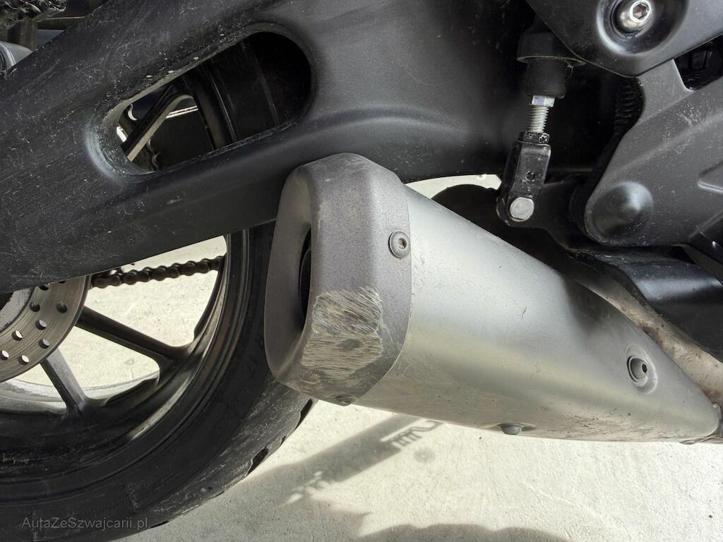 Schaden rechte Seite: Gabel inkl. Gabelbrücke beschädigt und verzogen, Lenker verzogen, Griffende verkratzt, Aussenspiegel verkratzt, Bremshebel oben gebrochen und unten verbeult/verkratzt, Wasserpumpengehäuse verkratzt, Schwinge hinten verbeult und verkratzt, Tank verkratzt, Abdeckung seitlich beschädigt, Aufzählung nicht abschliessend, Motor läuft, Motorrad nicht fahrbar da Bremshebel gebrochen.