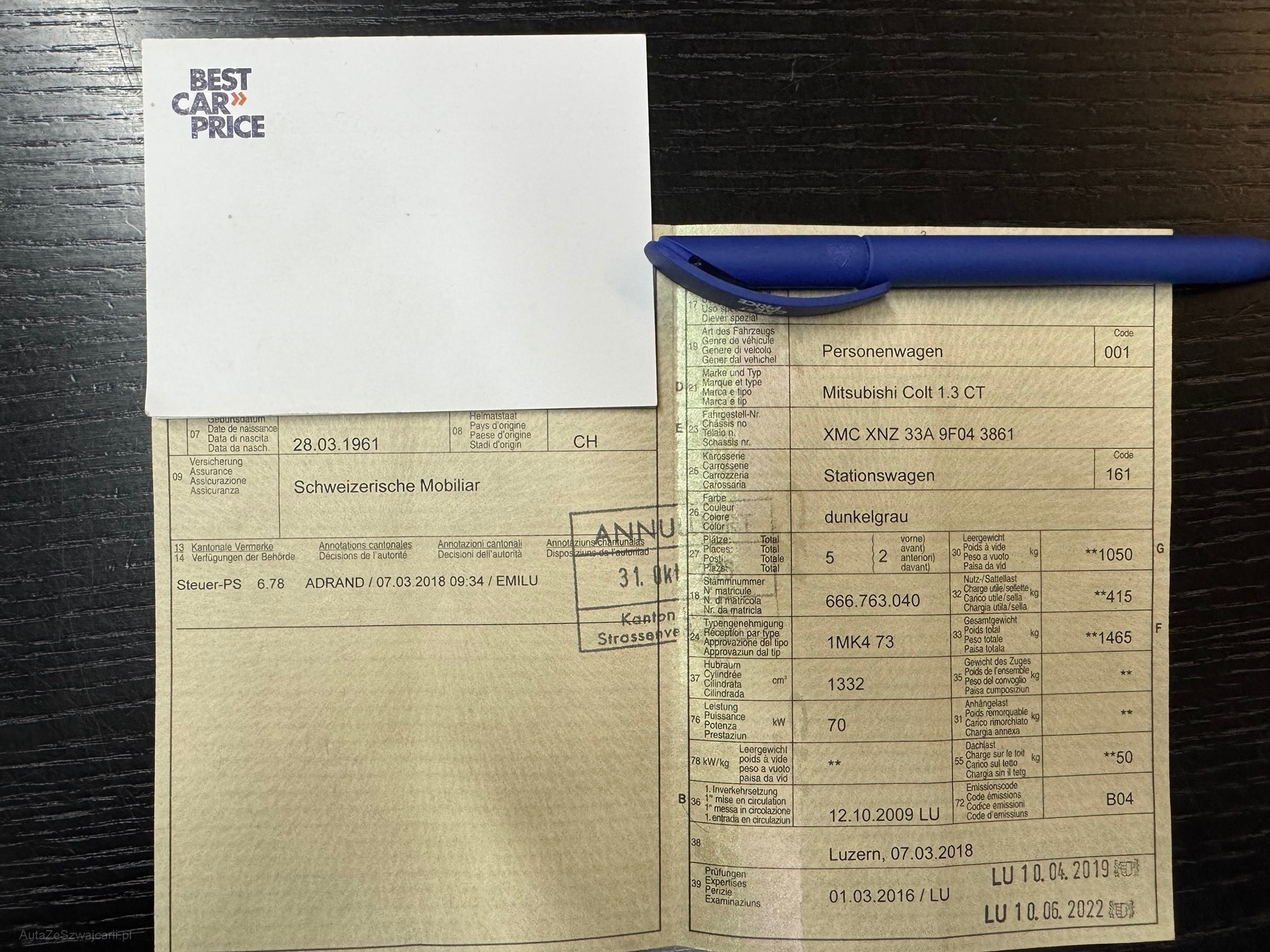 | Kommentar | Fahrzeug läuft einwandfrei. Motor und Getriebe i.O. Leicht Hagelschaden auf Dach und Motorhaube. Keine technische Prüfung (Werkstatttest) vorgenommen Fahrzeug ab Platz, ohne Garantie und Aufbereitung. Zustand Siehe Fotos. |