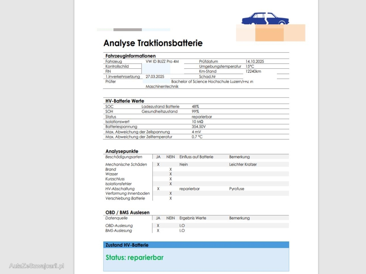 | Zusatzinformationen | Die Hochvoltbatterie wurde geprüft und ist reparierbar. Das Fahrzeug wird mit der HV-Batterie verkauft. Die Pyrofuse muss durch einen Fachbetrieb gewechselt werden.Die (vom Fahrzeugexperten) ermittelten Reparaturkosten beziehen sich auf das versicherte Ereignis. Allfällige zusätzliche, nicht versicherte Schäden/Vorschäden, sind in den Reparaturkosten nicht enthalten. Die deklarierten Ausstattungsmerkmale können von der effektiven Ausstattung abweichen.AchtungBei einem Hochvoltsystem - Spannungsfreiheit prüfen. Sicherheitshinweise und Betriebsanleitungen des Herstellers konsultieren und befolgen. Das Fahrzeug steht beim nachfolgend aufgeführten Standortbetrieb und muss vor Gebotsabgabe besichtigt werden.Bitte melden Sie Ihren Besuch beim Standortbetrieb telefonisch an:Autoverwertung Müller AGLuzernerstrasse 406144 Zell LU041 988 19 87 |