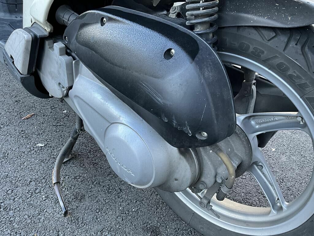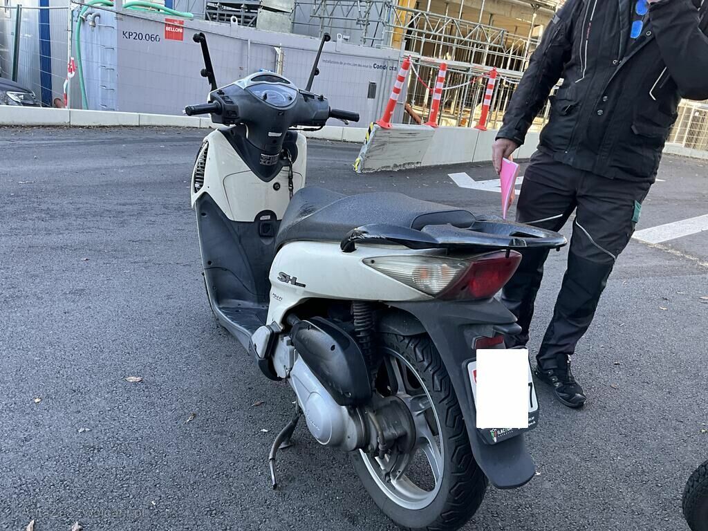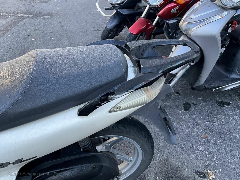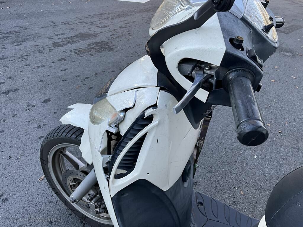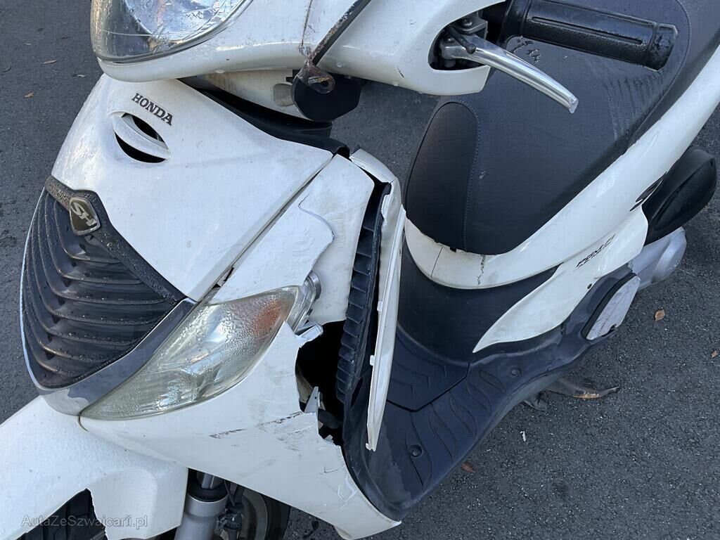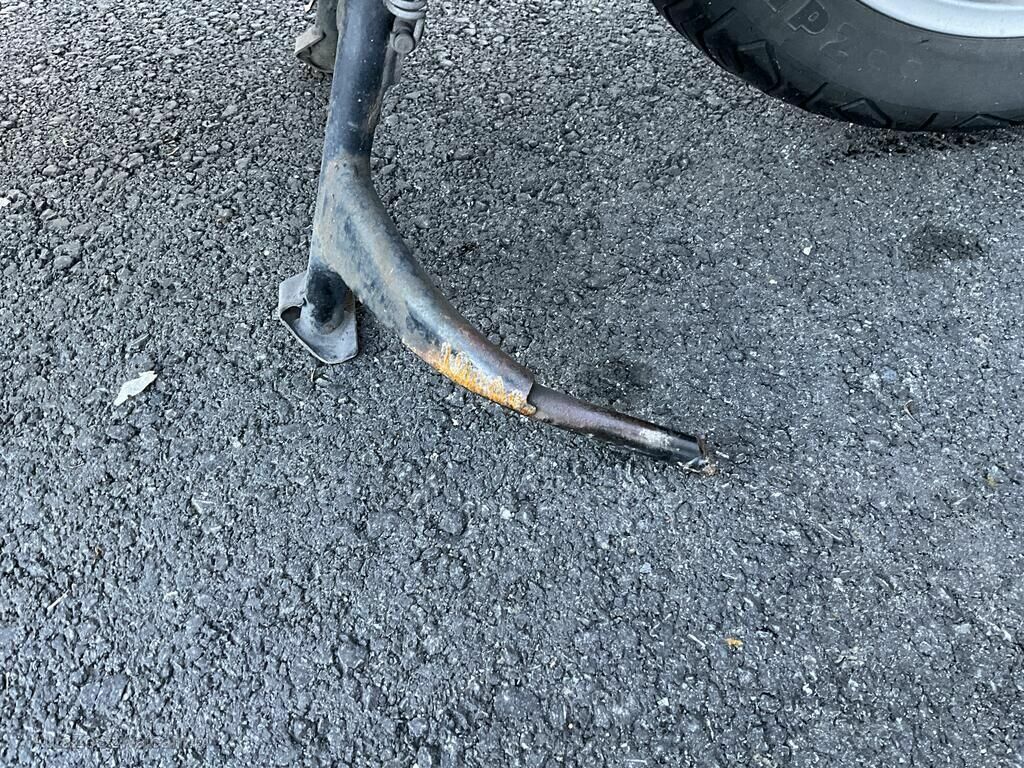 Garde boue AV, carénage flanc GA, plancher, levier GA, béquille, carter GA, poignée ARG, phare AV endommagés.