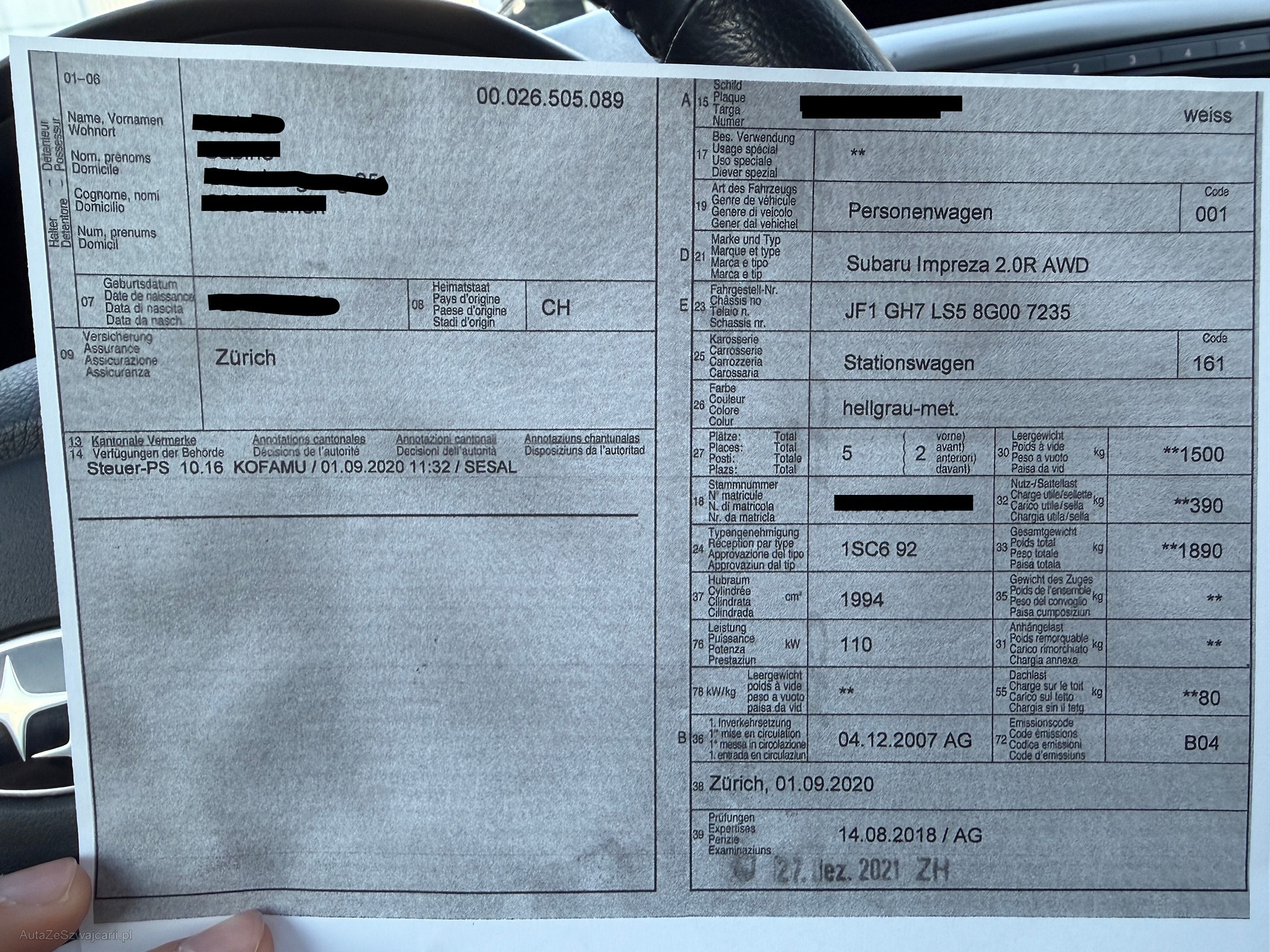| Kommentar | Fahrzeug läuft einwandfrei, es leuchten keinerlei Warnlampen oder sonstiges. Mängel: Stosstange vorne links und Kotflügel vorne links verkratzt müssen lackiert werden. Winterpneu vorne sind abgefahren. 1 Schlüssel vorhanden Fahrzeug ist bereits eingetauscht und wird nur abgegeben werden wenn wir einen Mindestreis von Fr. 2`800.- und mehr erzielen. Fahrzeug muss innert 3 Arbeitstagen Abgeholt werden. |