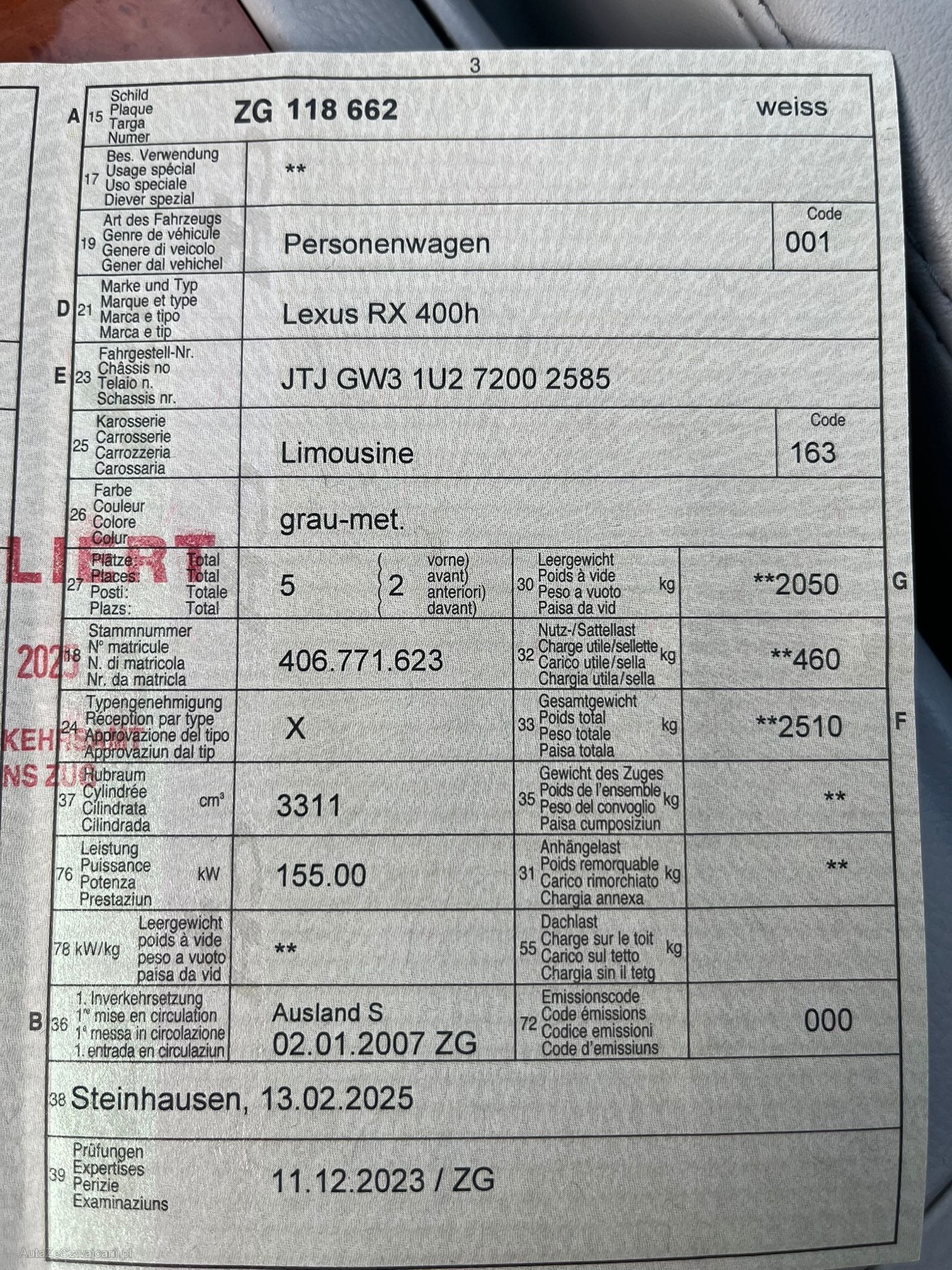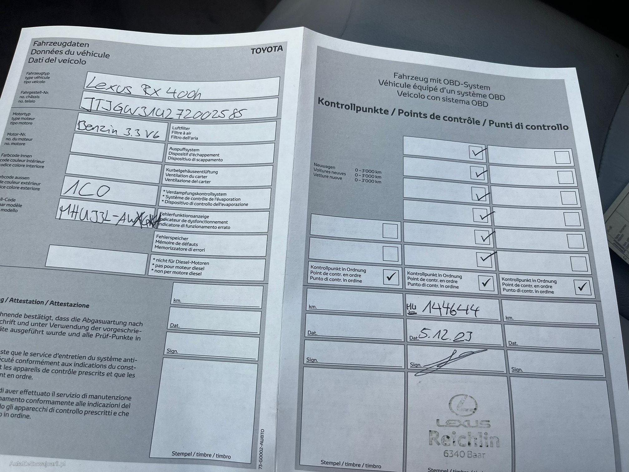 | Kommentar | _Keine technische Prüfung durchgeführt _Steinschlag Fronscheibe (siehe Bilder) _Div. kleinere Steinschläge Front/Haube z.T rostig (siehe Bilder) _Div. Kratzer und Dellen (siehe Bilder) _Scheinwerfer V.L leicht ausgebleicht, siehe Bilder _Bordcomputer auf Meilen eingestellt --> 155002 Meilen |