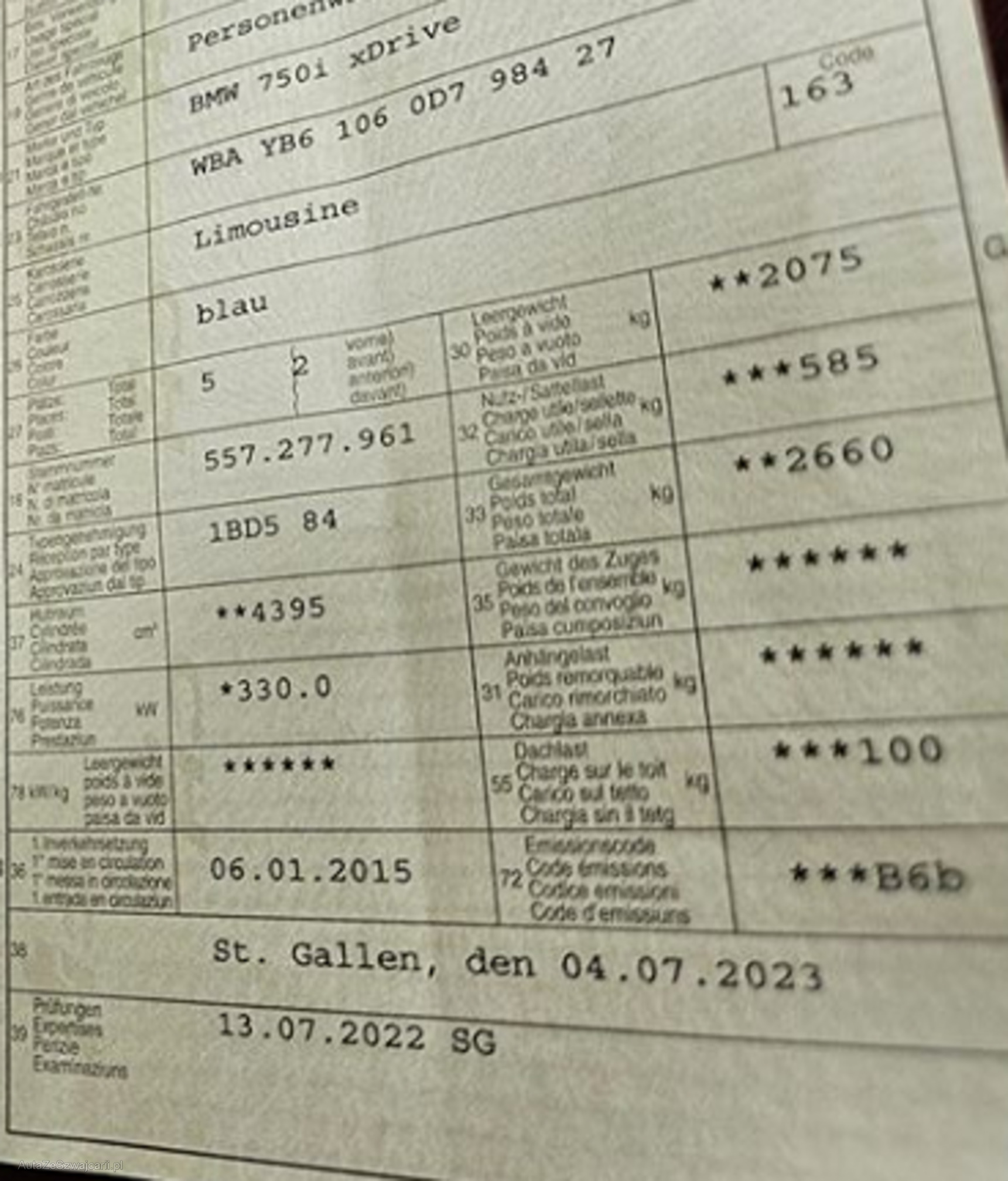 | Kommentar | Angeboten wird ein BMW 750i x Drive Das Fahrzeug fährt sich gut, jedoch mach das Differential Geräusche.Ursache unbekannt. |