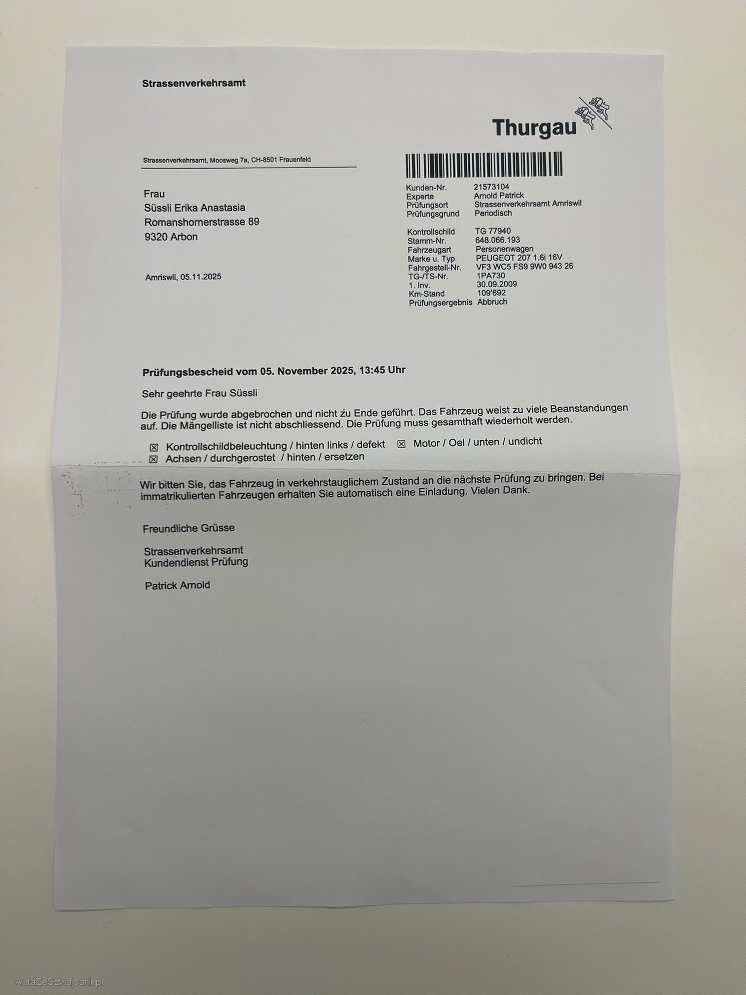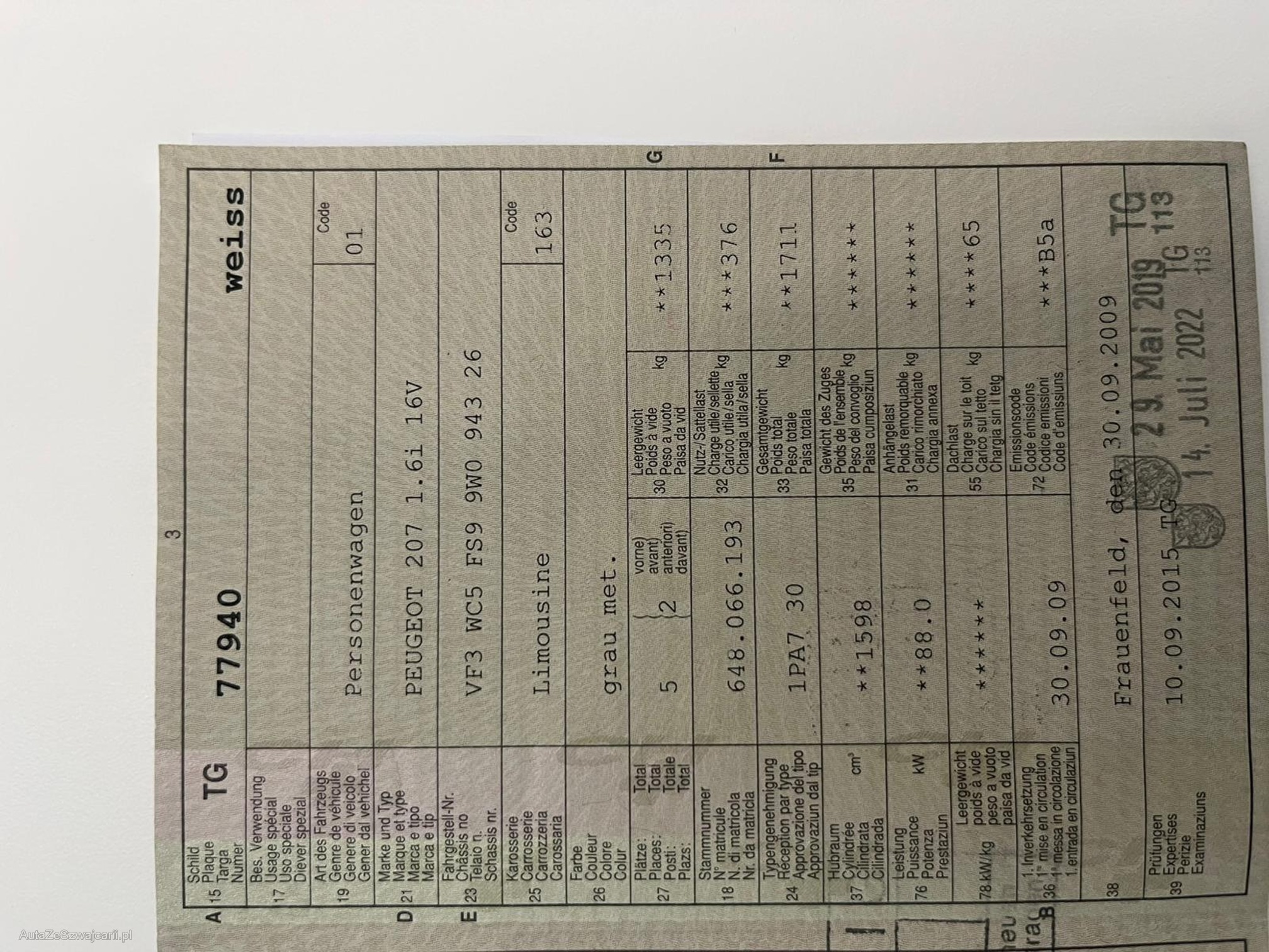 | Kommentar | Mängelliste vorhanden siehe Bilder. Fahrzeug läuft und kann gefahren werden. Warnlampen leuchten keine. 2 Schlüssel vorhanden sowie Serviceheft. Hat 4 Stahlräder mit Winterpneu. Hinten leicht beschädigt vorne kleine Bäule (Siehe Bilder) Zustand innen und aussen für Alter und km. gut. Fahrzeug muss innert 7 Tage abgeholt werden ( Banküberweisung) |