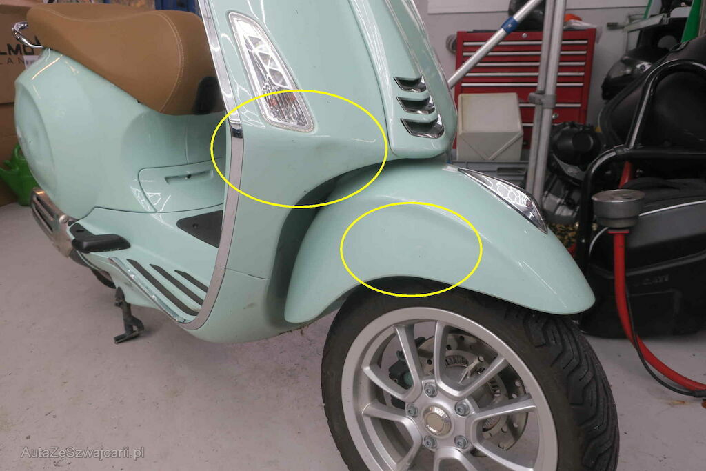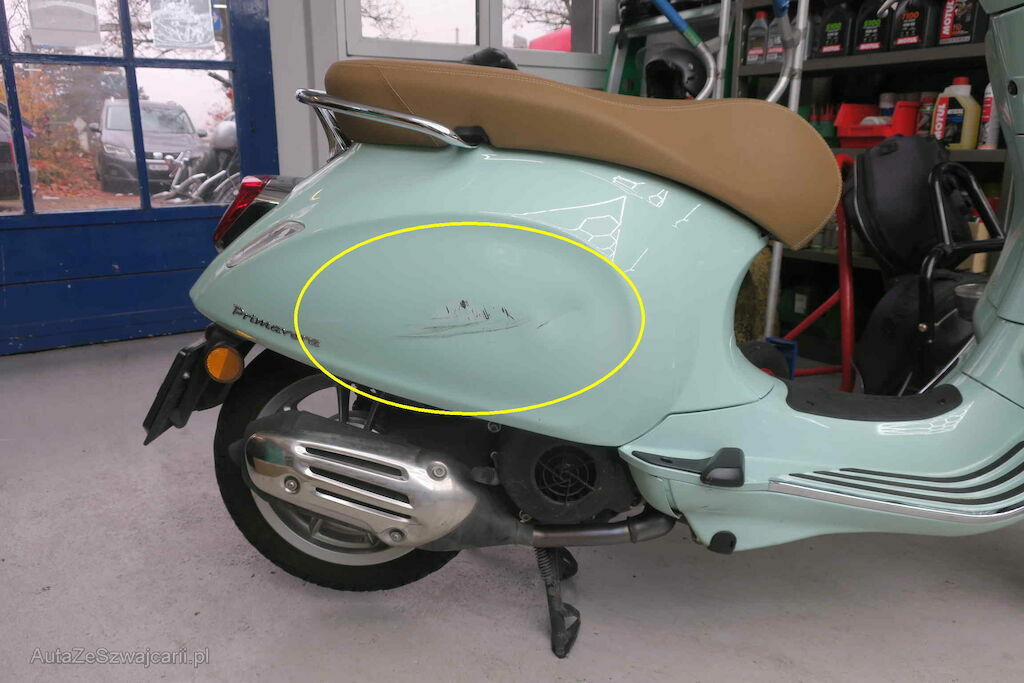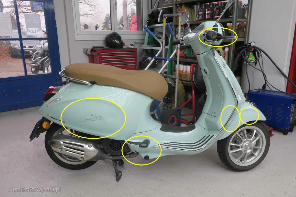 Rechte Seite: Rahmen hi. und vo. rechts, Kotflügel vo. rechts, Schalldämpfer, Lenker rechts, div. Verkleidungen rechts.