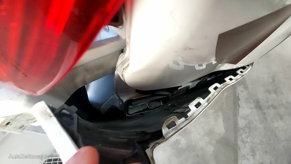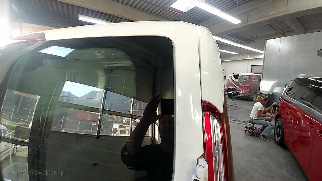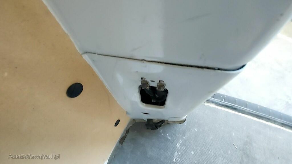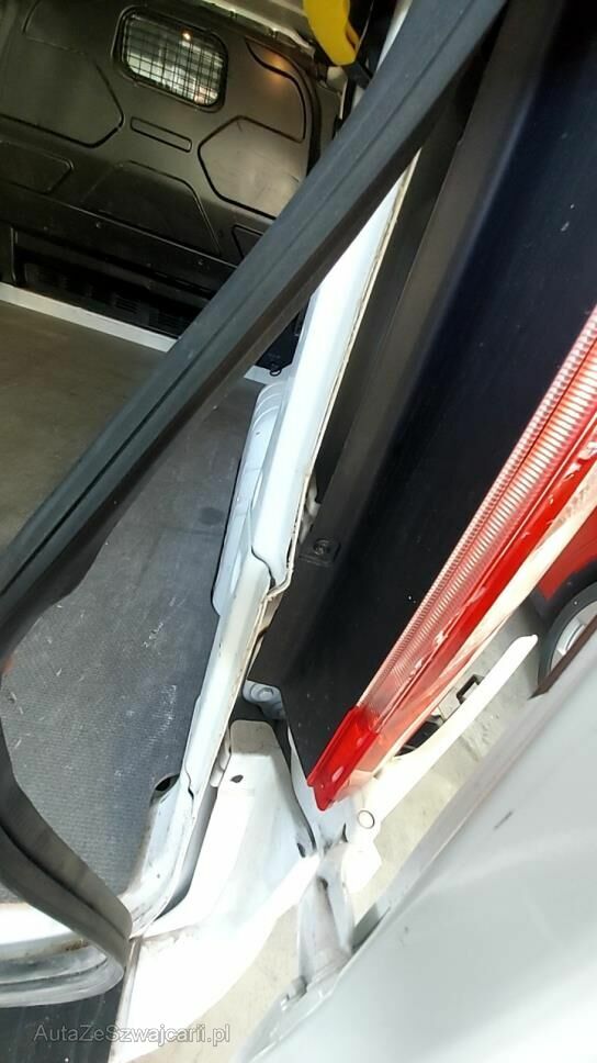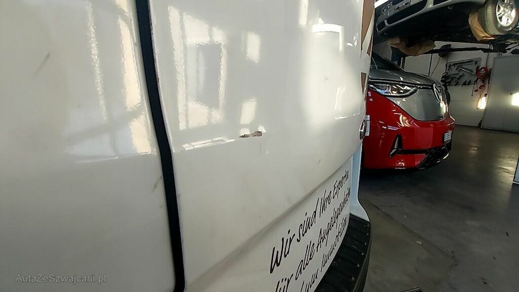 Ecksäule rechts und Seitenwand h.r. in der ganzen Höhe eingedrückt und gestaucht. Innenverblechung im Aufprallbereich teilweise eingedrückt. Flügeltüre r. eingebeult und verkratzt.