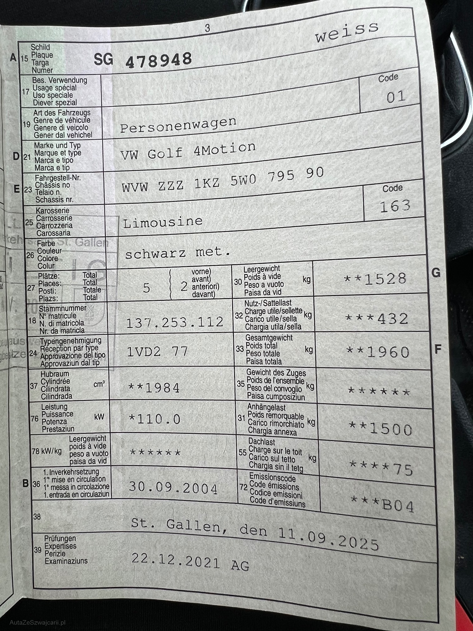| Kommentar | Kein Werkstatttest durchgeführt Fahrzeug Fahrbar, für Export |