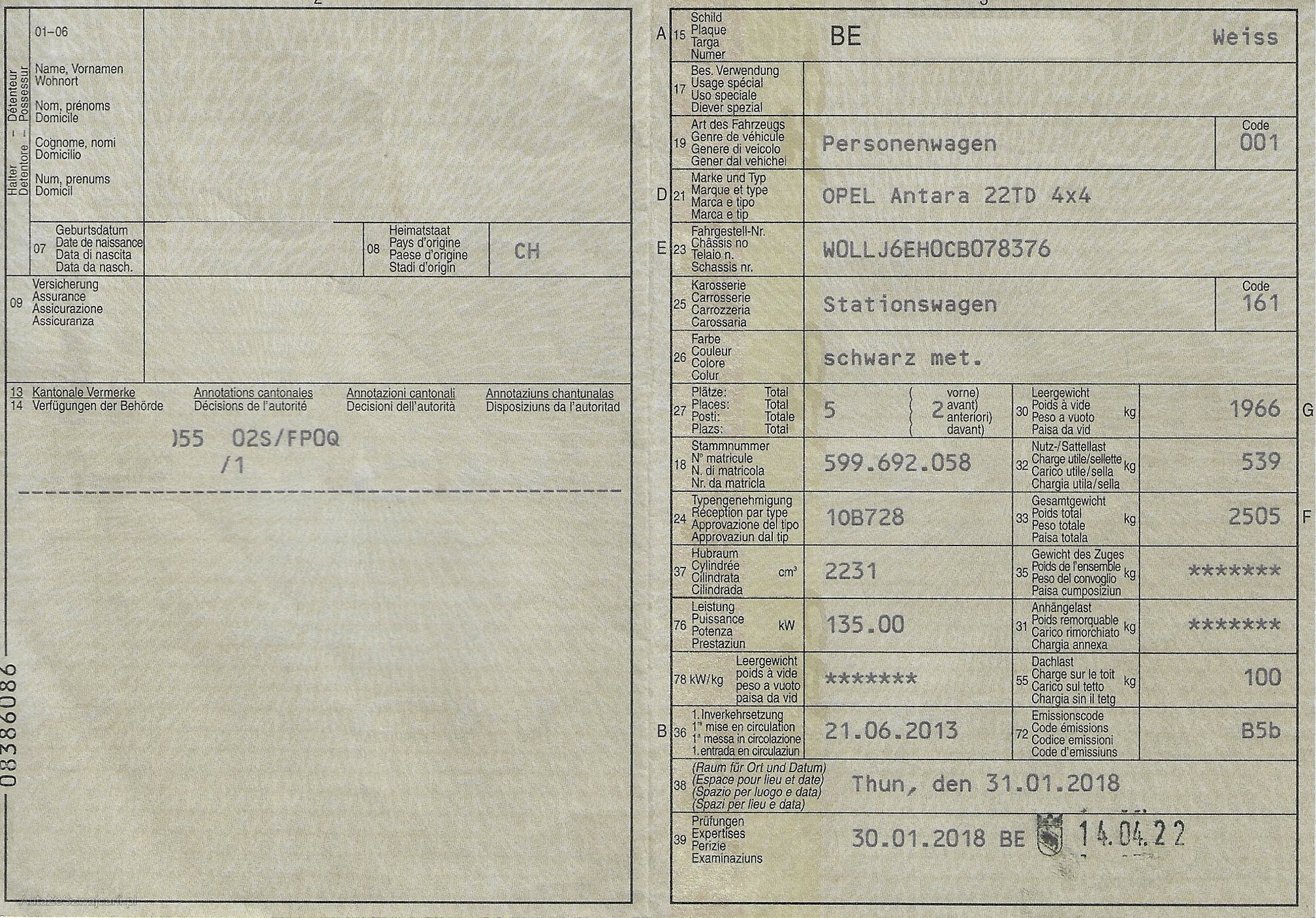 | Kommentar | Es wurde kein Werkstatttest durchgeführt. Partikelfilter wurde im August 2018 bei Km 133'847 bereits ersetzt. Hagelschaden Motorhaube + Dach. Inkl. 4 Winterräder auf Stahlfelgen. |