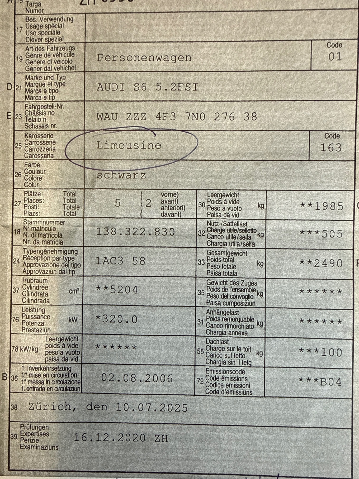 | Kommentar | Diverse Schäden, Auto hat Zündaussetzer, Motorlampe an, Seitenwand mit Spraydose gesprüht. Ab Platz, muss mit Transporter an folgender Adresse abgeholt werden: Rothfluhstrasse 54, 8702 Zollikon |