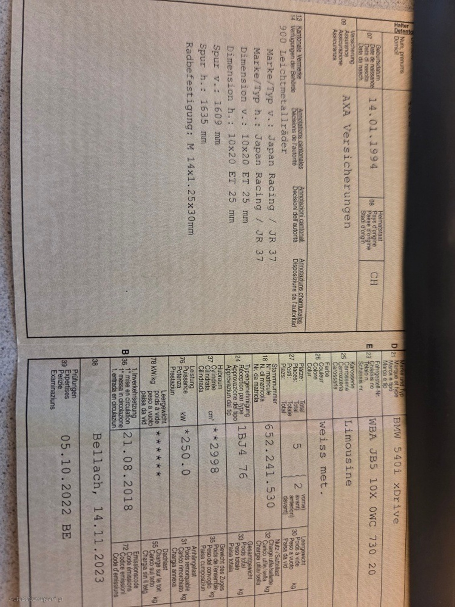 | Kommentar | Sonderausstattungen gemäss Beilage. Es wurde kein technischer Zustandsbericht erstellt. Fahrzeug aussen sehr gepflegt. ein paar kleinere Steinschläge vorne in Stossstange. Räder eingetragen im Fahrzeugausweis . Beiblätter gemäss Beilage |