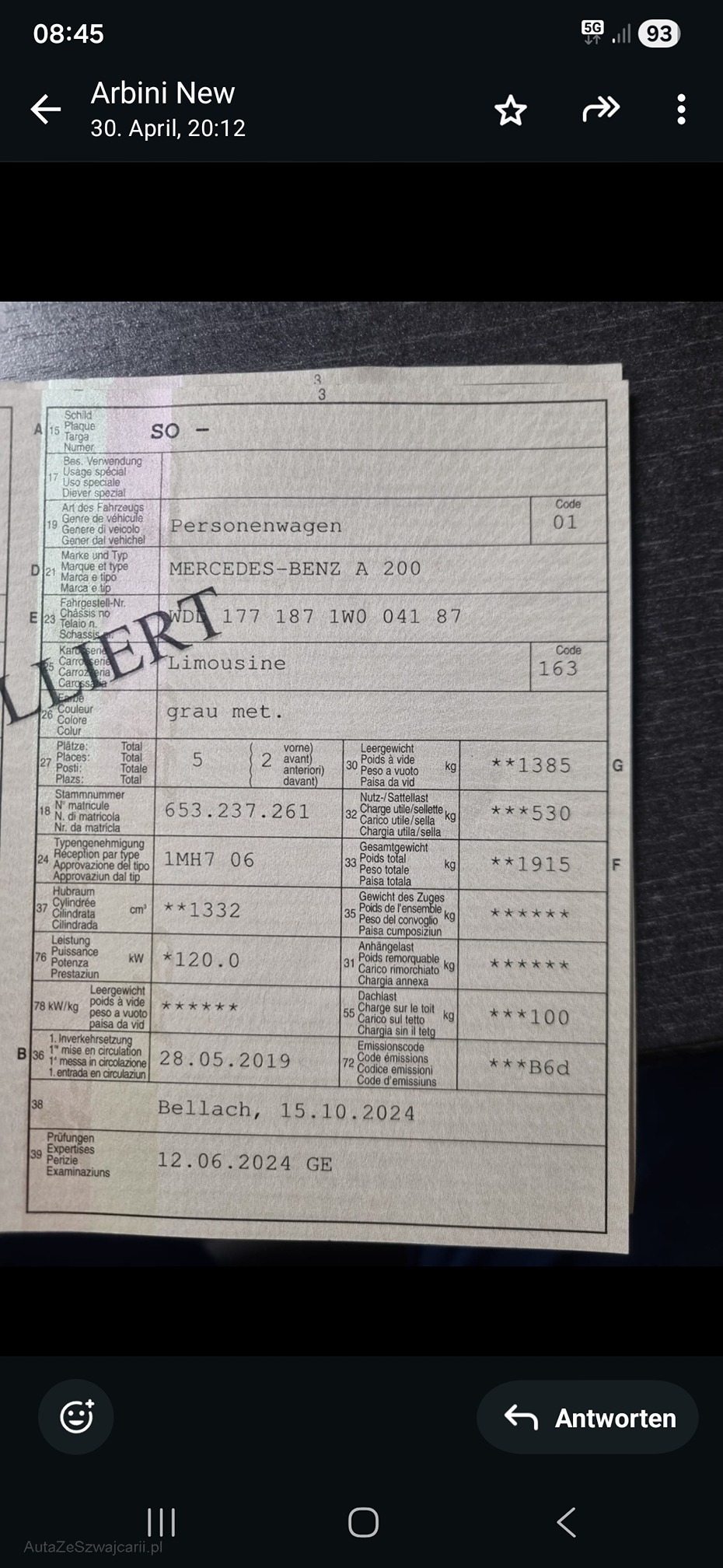 | Kommentar | Fahrzeug hatte, nach Recherche einen grösseren Schaden auf der Linken Fahrerseite, sowie Front, Teilweise nicht Fachmännisch gut Repariert, Siehe Bilder. Fahrzeug ab Platz, Für sichtbare und nicht Sichtbare Mängel wird nicht gehaftet. Keine Garantie keine Minderung möglich. Keine Nachverhandlung. Fahrzeug technisch keine Probleme. Fährt sich Normal. Stossstange vorne unter Scheinwerfer riss. |