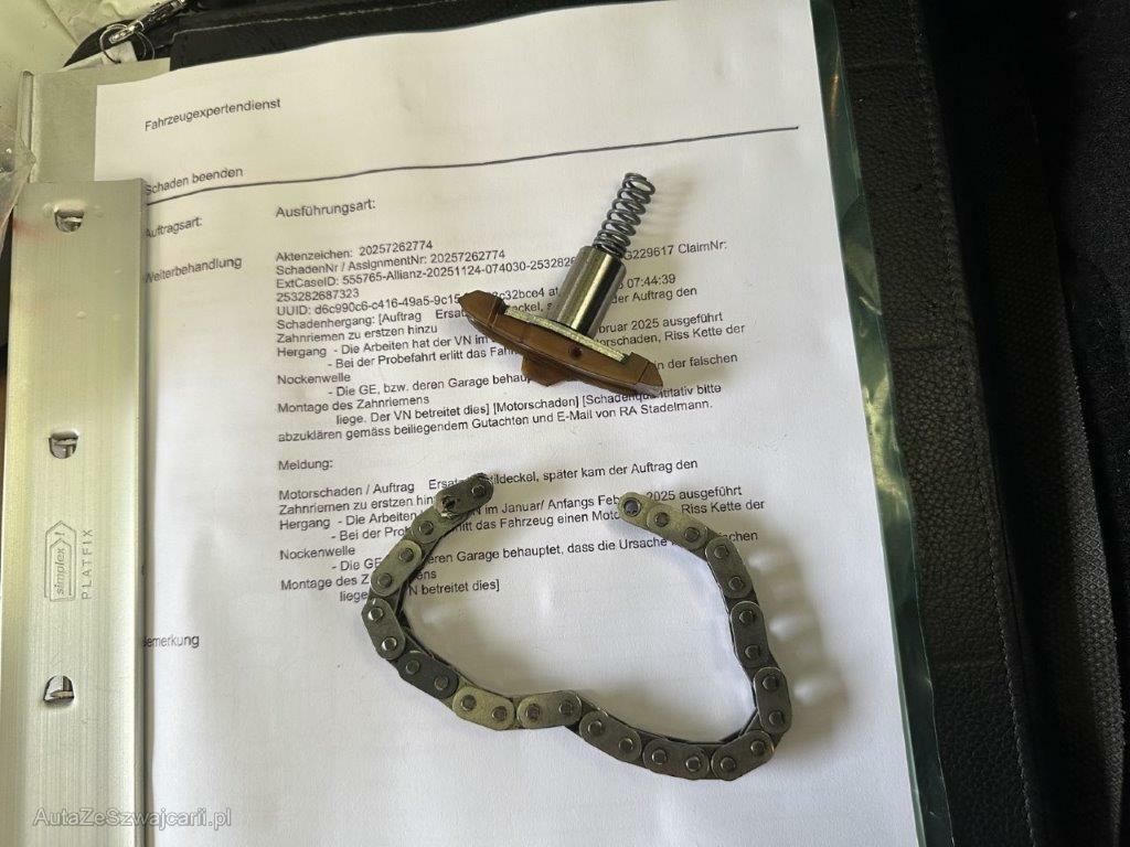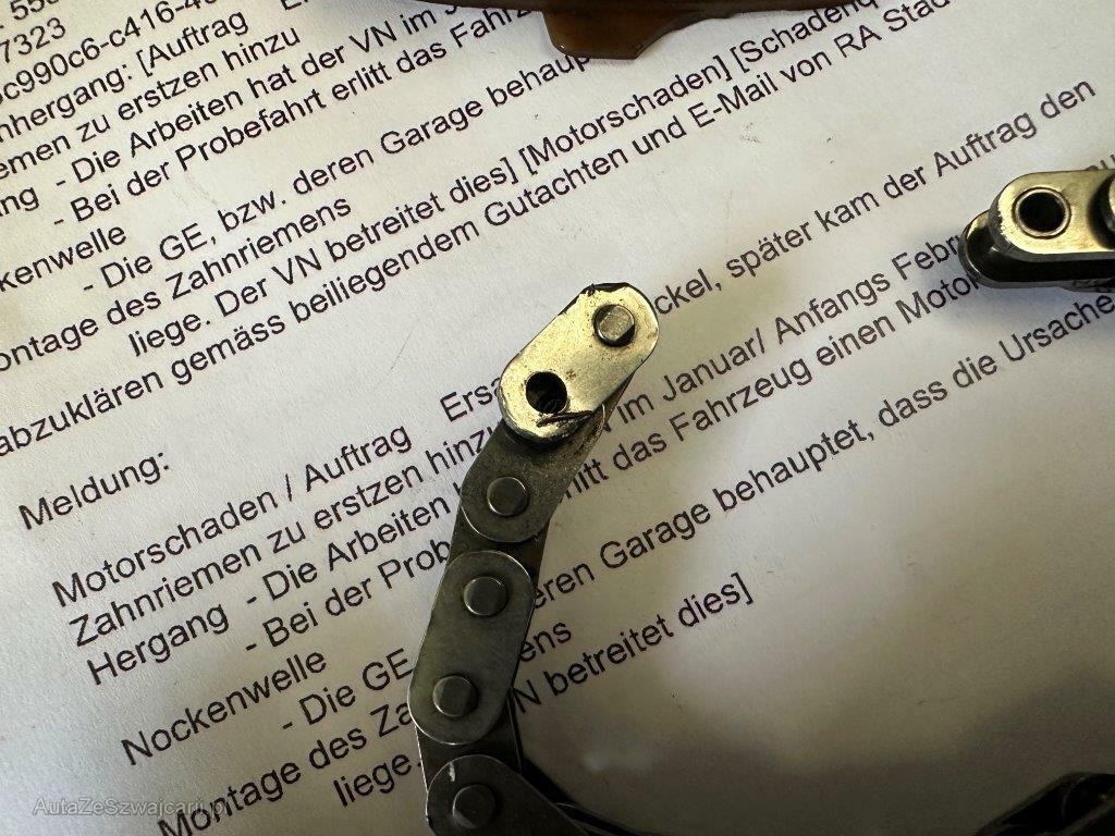 | Schadensbeschreibung | Zahnriemen ersetzt. Danach ist die Kette der Nockenwelle vom 1. bis 3. Zylinder beschädigt worden und zerrissen. Die Einlassventile sind angestanden. Motorschaden. Risiko Automat! / Vorschäden: Gebrauchsspuren |