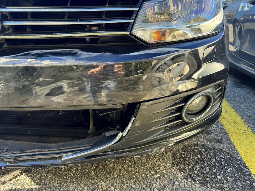 Urto parte anteriore: paraurti, griglie, mascherine, faro sinistro, supporti, traversa e altri componenti danneggiati. Radiatori a rischio.