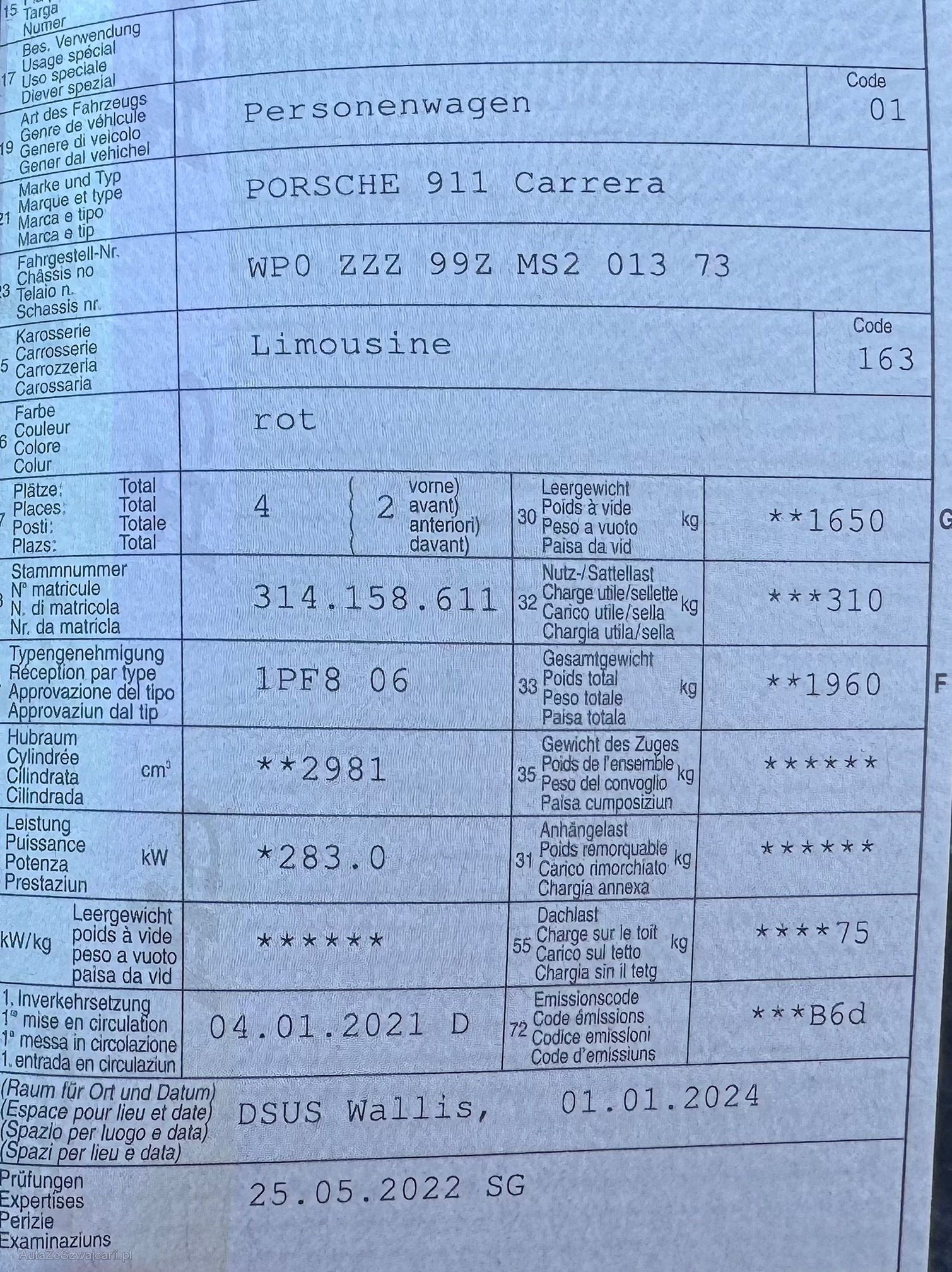 | Kommentar | Wunderschöner Porsche ! Sommerräder + Winterreifen. Am Fahrzeug wurde kein Werkstatttest gemacht (Für sichtbare oder nicht sichtbare Mängel wird nicht gehaftet). Wir testen und prüfen nicht alle Funktionen vom Fahrzeug. Das Risiko liegt somit vollumfänglich beim Käufer. Nach erhalt des Zuschlags, gibt es keine Nachverhandlung, auch wenn nicht deklarierte Mängel zum Vorschein kommen. Ab Platz ohne Garantie oder Gewährleistung, Wandelung und Minderung werden wegbedungen |